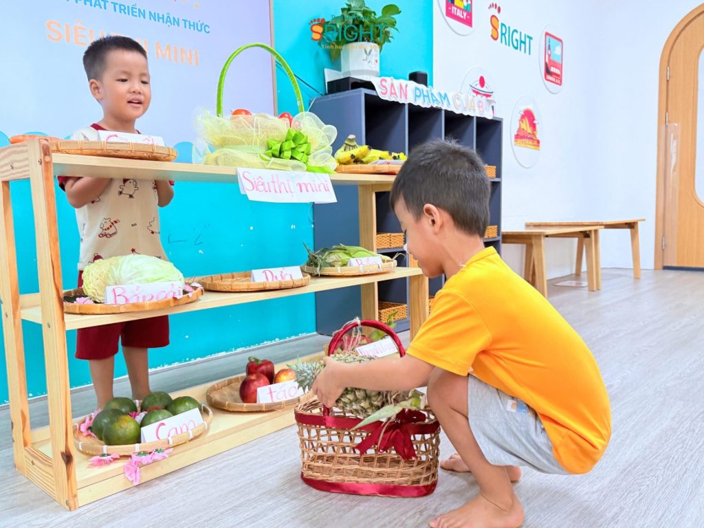 The mini-supermarket activity is a fantastic way for children to develop cognition about the world around them. They learn to categorize vegetables and fruits while identifying colors and shapes. Simulating the buying and selling process helps the child’s brain process information flexibly, thereby stimulating logical thinking and problem-solving skills from a very young age.