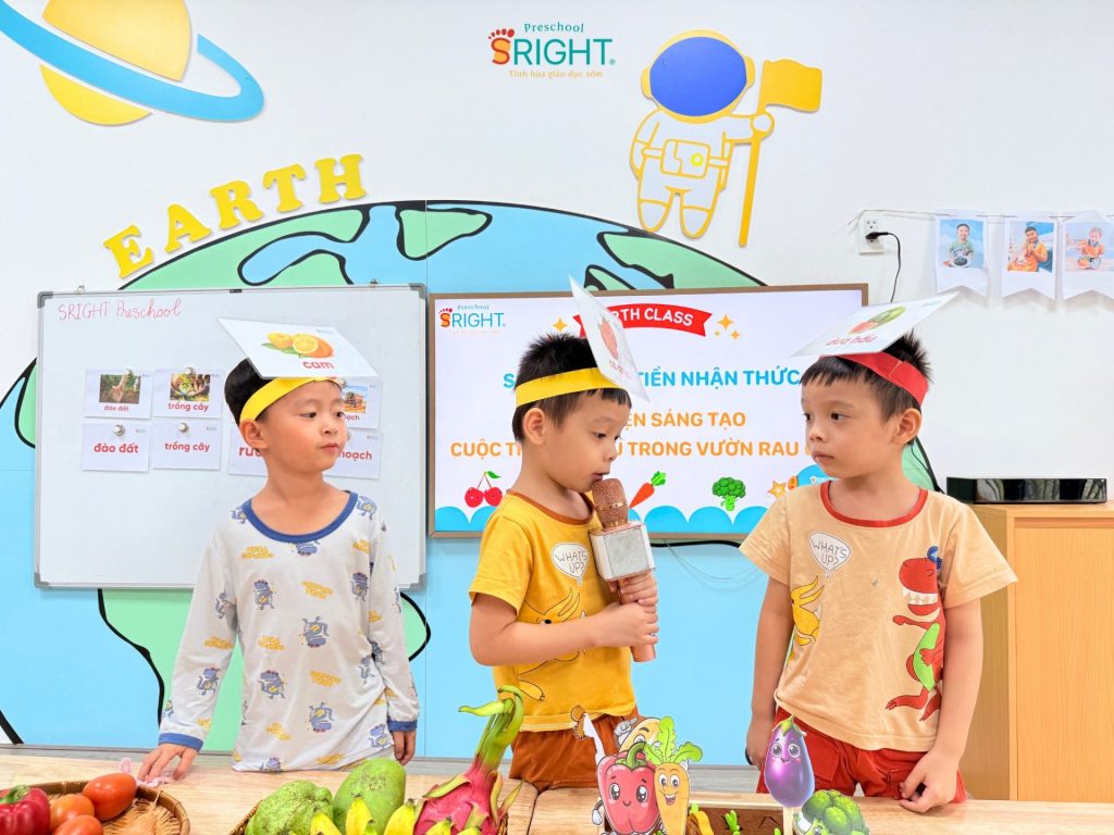 At the SRIGHT preschool environment, we consistently create conditions for children to access knowledge through multiple senses. Our teachers brought a miniature vegetable garden right into the classroom, combined with a system of vibrant flashcards to spark ideas for our “mini-storytellers.” This activity not only helps children recognize colors and shapes but also provides an excellent opportunity for language development by naming and describing the characteristics of each food item.