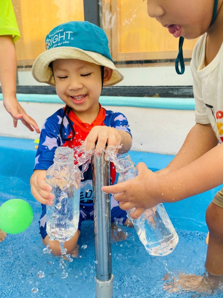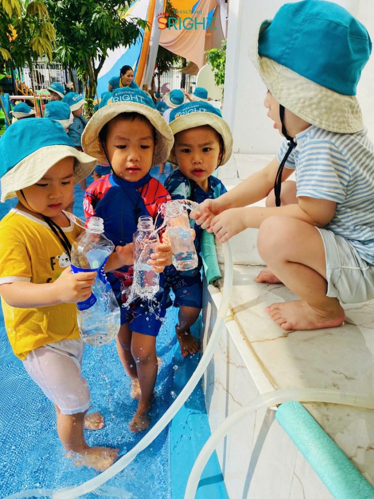 In the refreshing pool area filled with adorable water toys, the little ones from Country Class freely splashed around, enjoying the golden sunshine and cool breezes. Through this activity, SRIGHT Preschool skillfully integrates early childhood lessons such as: developing fine and gross motor skills, recognizing colors through water play, and practicing the social skills of taking turns and sharing toys with friends. These moments help children learn to enjoy healthy fun in a safe and loving environment.