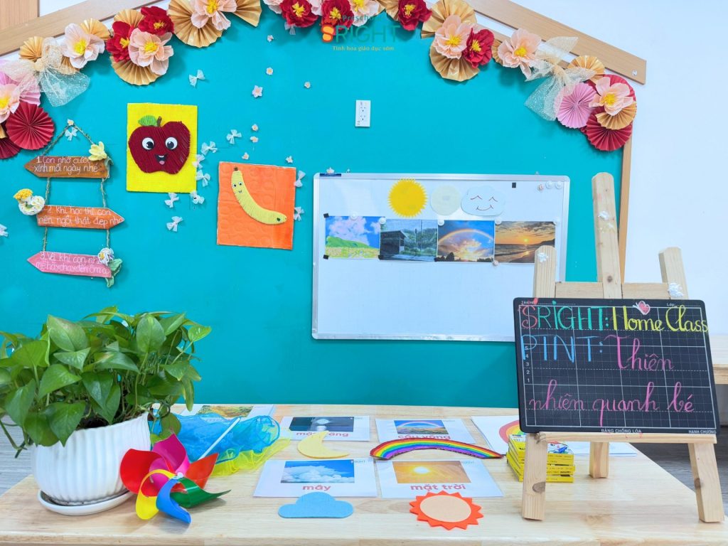 At Sright Preschool, a premier preschool in Thu Duc, we implement right brain activation methods to help children absorb knowledge through visual imagery and authentic emotions. During the lesson, Home Class students were introduced to familiar symbols such as the radiant sun, the gentle moon, fluffy clouds, and colorful rainbows. Listening to teachers’ stories combined with vivid explanations helps children form strong visual thinking, thereby expanding their vocabulary and understanding of natural elements in their daily lives.