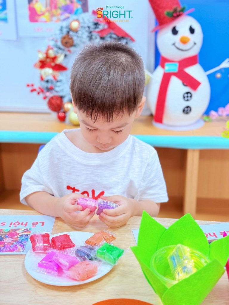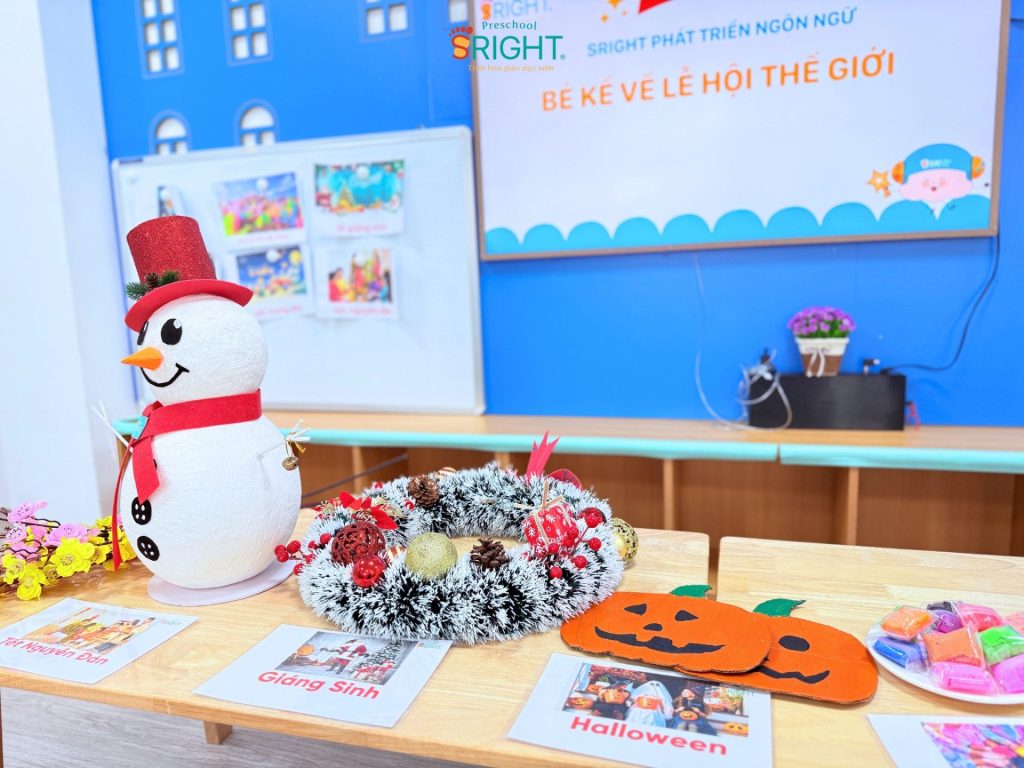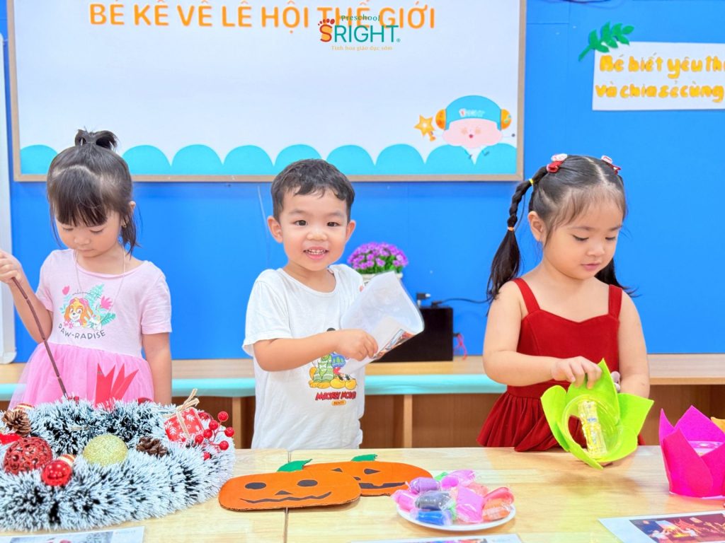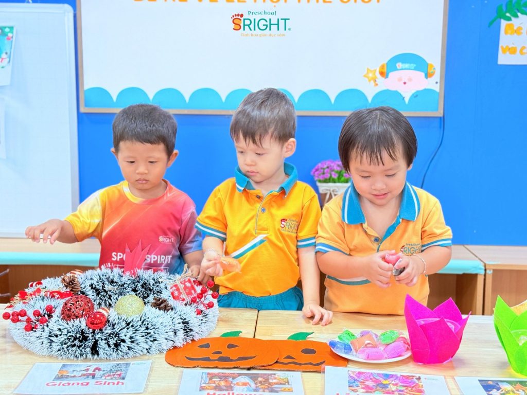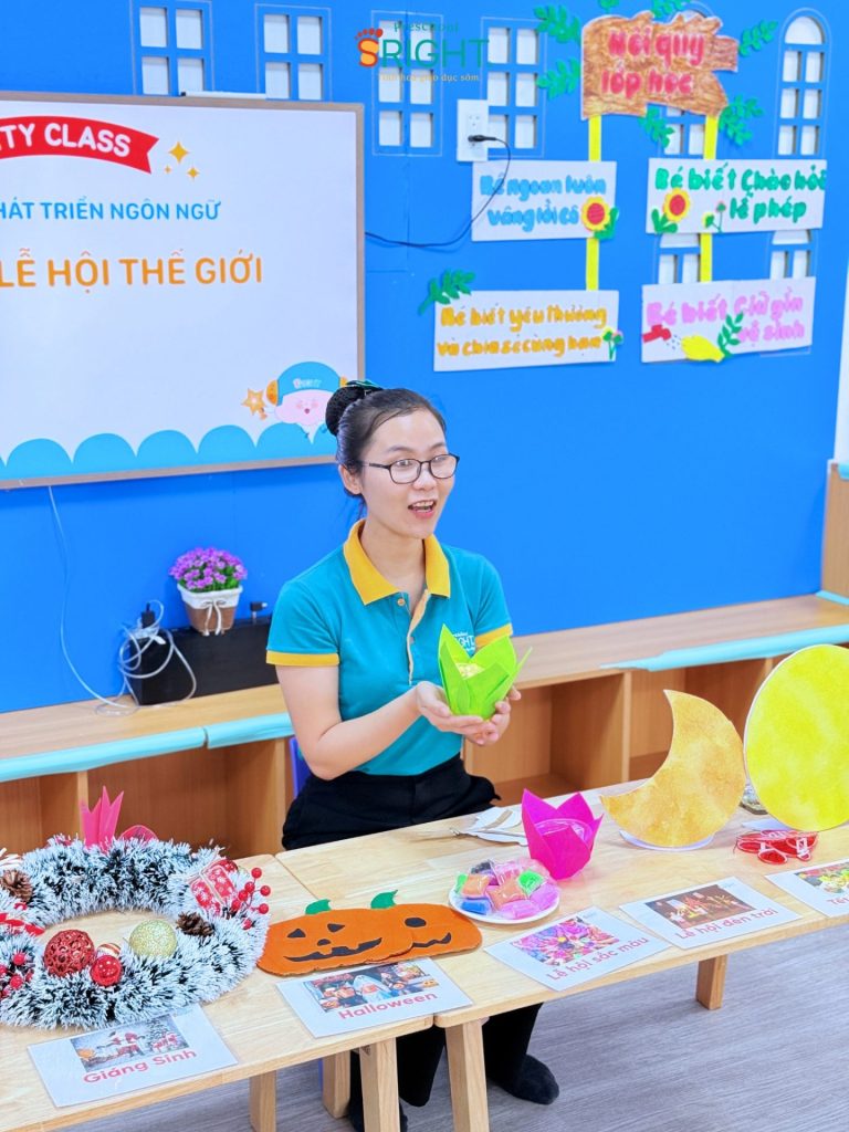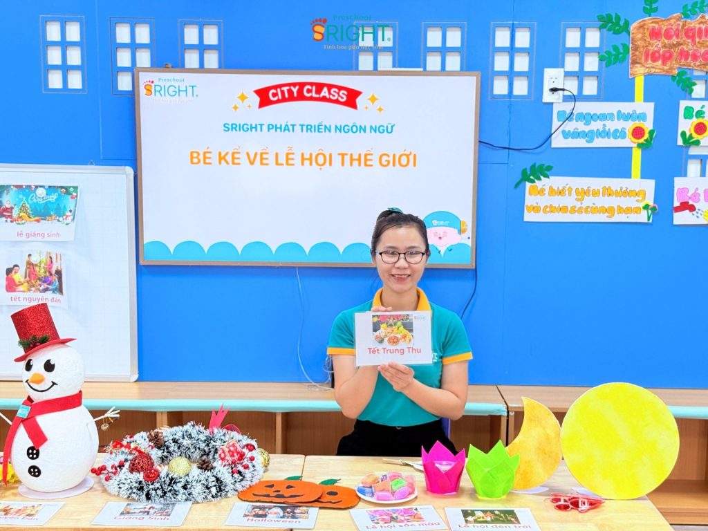 At Sright Preschool, a premier preschool in Thu Duc, we implement right brain activation methods by utilizing a system of colorful Flashcards and meticulously prepared learning materials. During the lesson, teachers gently opened up a vibrant world, allowing children to easily absorb images of diverse cultures. Observing and memorizing the whole patterns of iconic festival symbols helps children’s brains form high-quality neural connections. Through this, City Class students do not just recognize the world; they develop the ability to process visual information keenly and optimally.