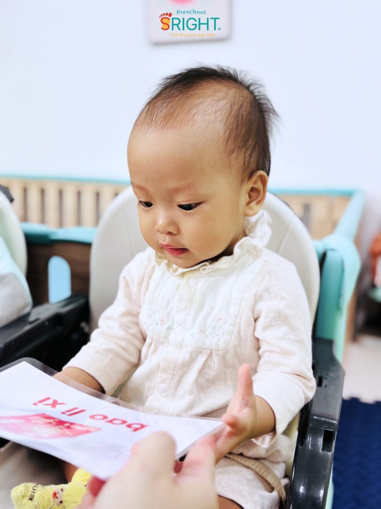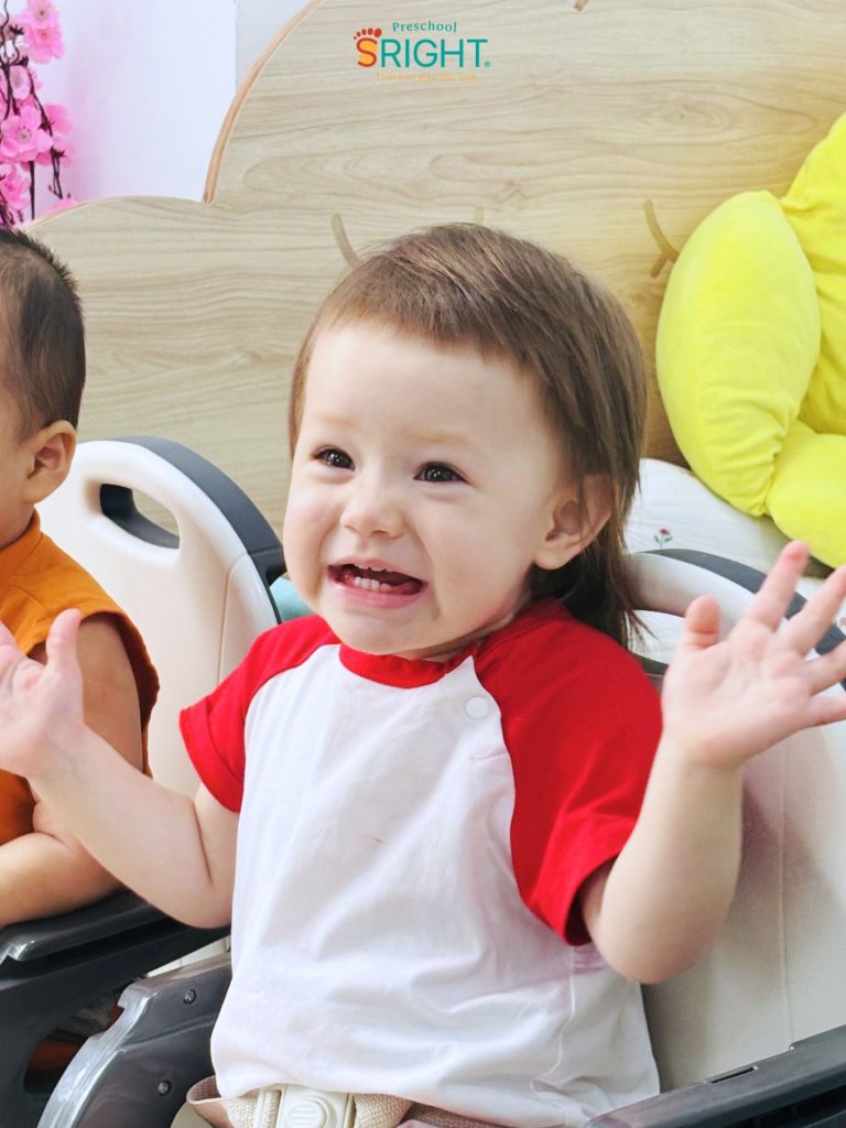 At Sright Preschool, a premier preschool in Thu Duc, we place special emphasis on right brain activation methods for infants through exposure to vivid imagery, rhythmic sounds, and positive emotions. In today’s lesson, Baby Class SRIGHTers observed bright red envelopes and golden apricot blossoms while listening to cheerful Spring melodies. This visual and auditory interaction stimulates neural pathways, helping infants form their first cognitive reflexes regarding space and color—a vital precursor to future creative thinking.