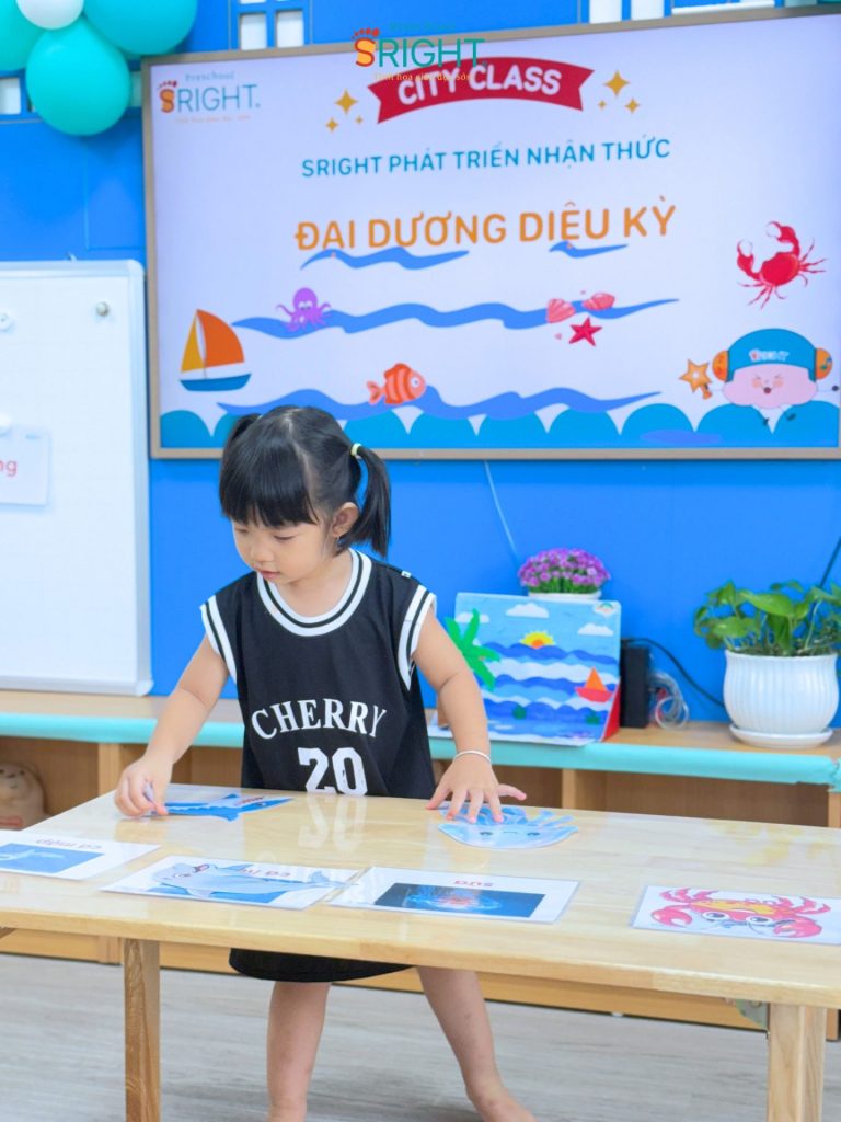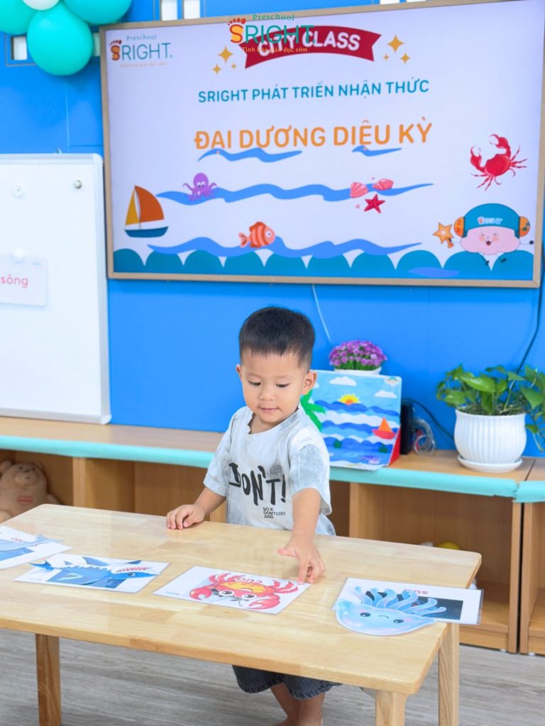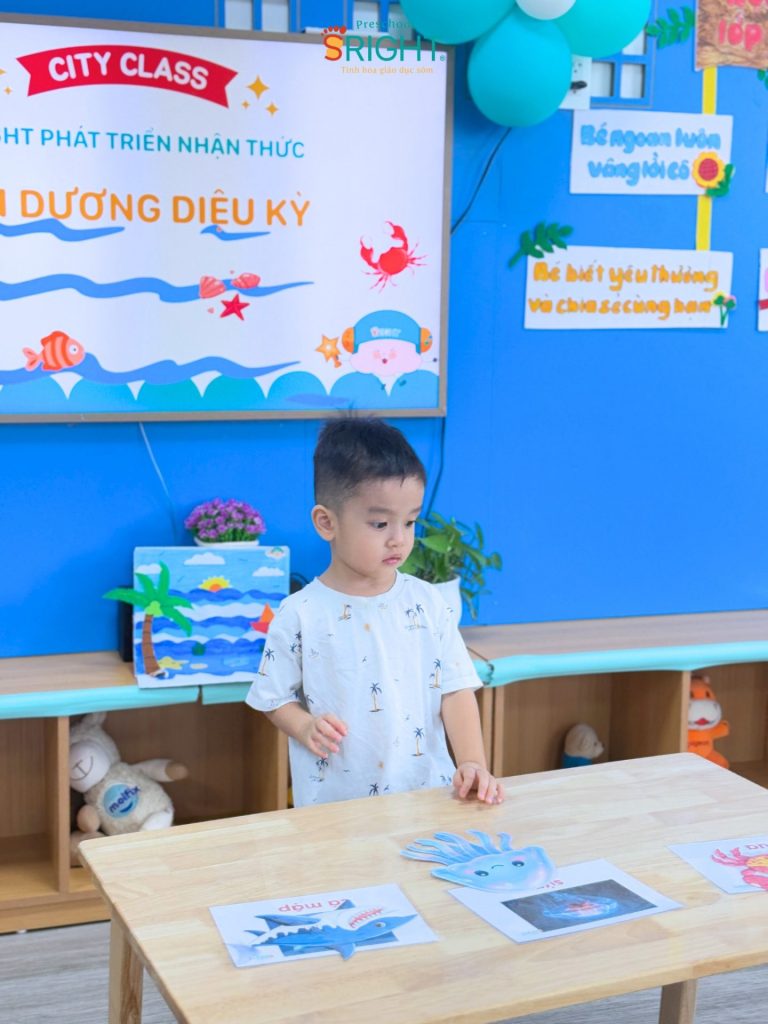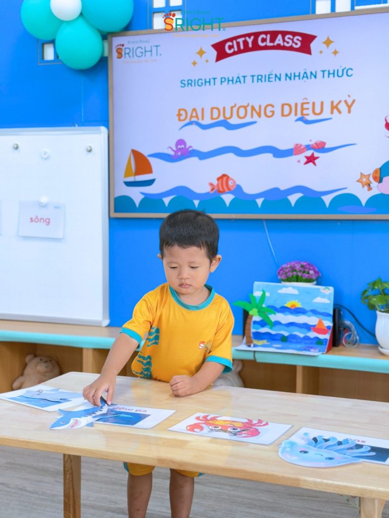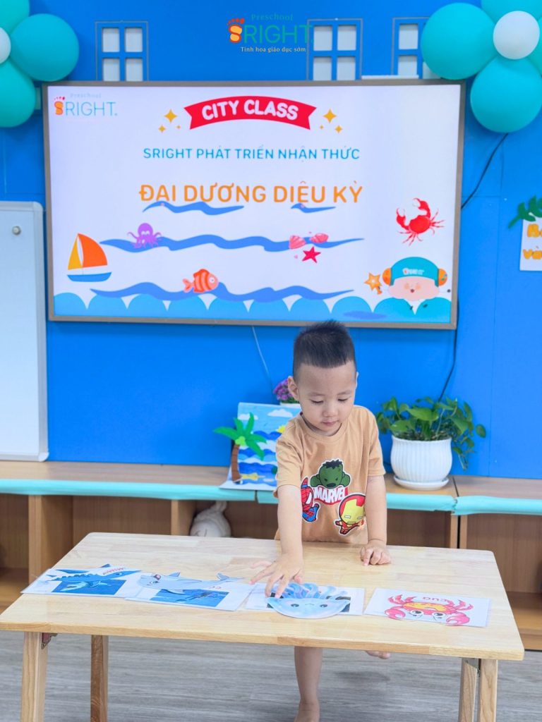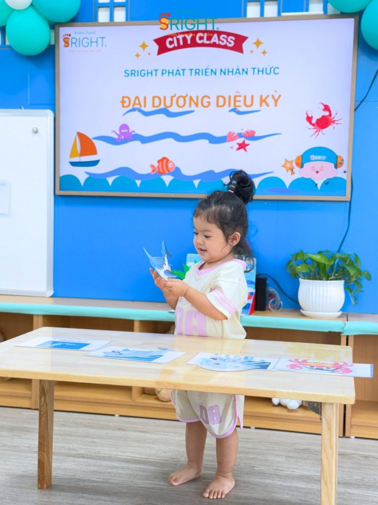 At Sright Preschool, a premier preschool in Thu Duc, we implement right brain activation methods by utilizing eye-catching and realistic visual learning materials. During the lesson, the underwater world appeared remarkably close through images of adorable and brilliant marine creatures. By observing, identifying habitats, and naming each sea friend, children help their brains form high-quality neural connections. This method not only helps children retain information longer but also develops visual thinking and sharp information processing skills.