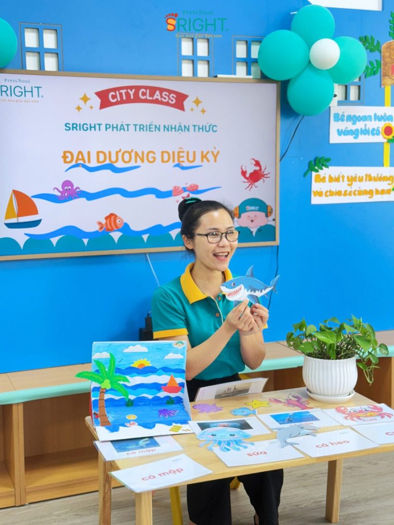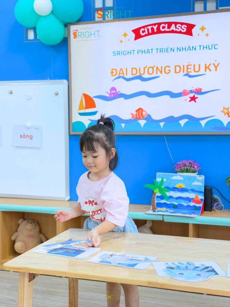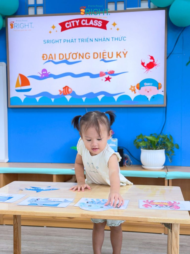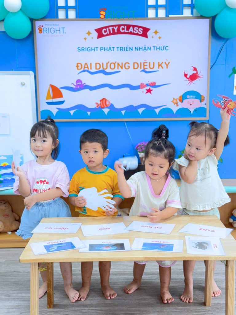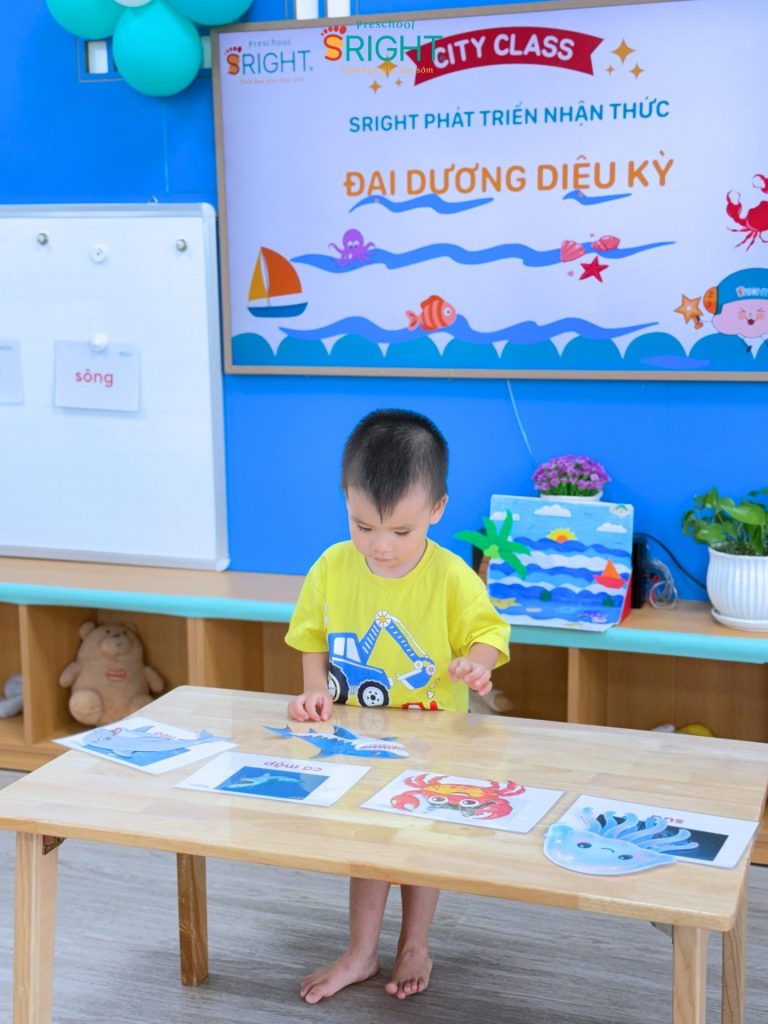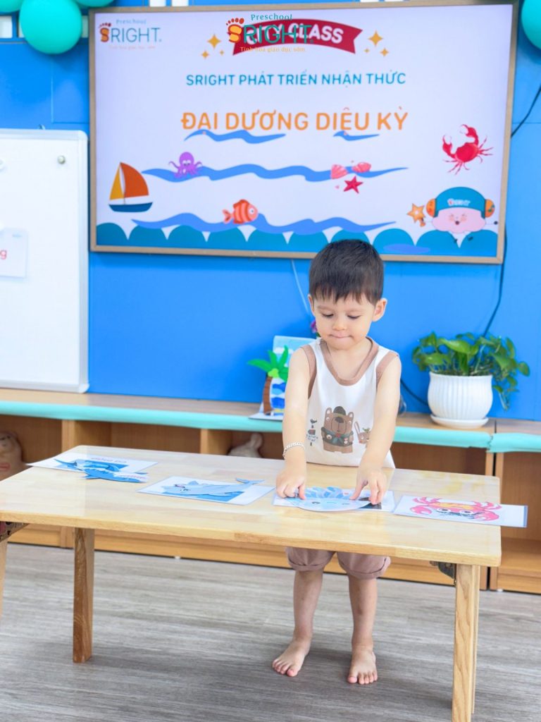 At Sright Preschool, a premier preschool in Thu Duc, we implement right brain activation methods by utilizing eye-catching and realistic visual learning materials. During the lesson, the underwater world appeared remarkably close through images of adorable and brilliant marine creatures. By observing, identifying habitats, and naming each sea friend, children help their brains form high-quality neural connections. This method not only helps children retain information longer but also develops visual thinking and sharp information processing skills.