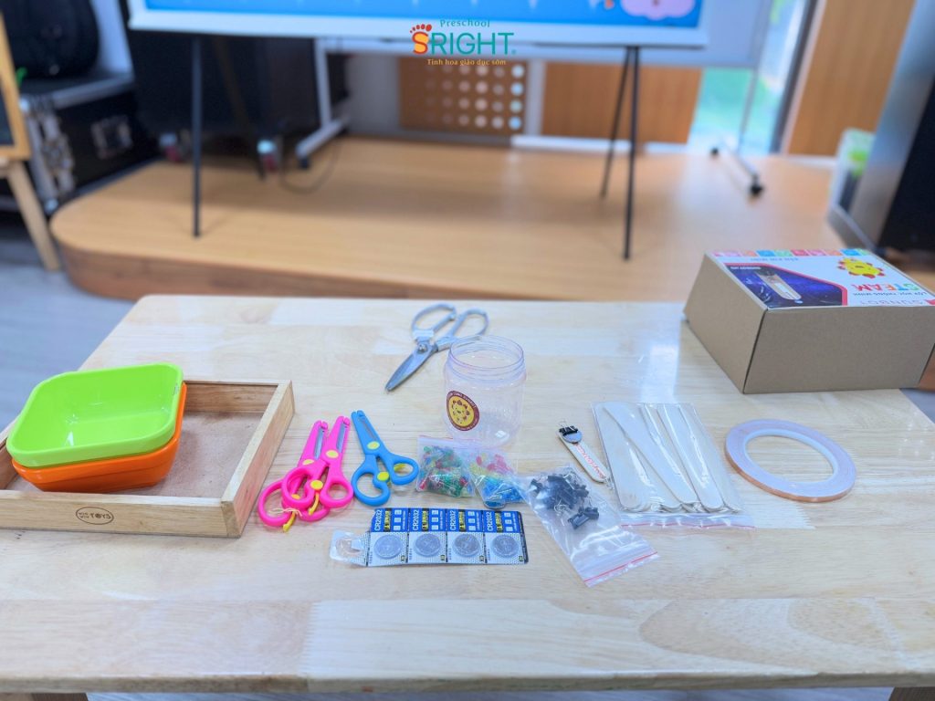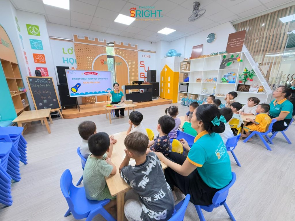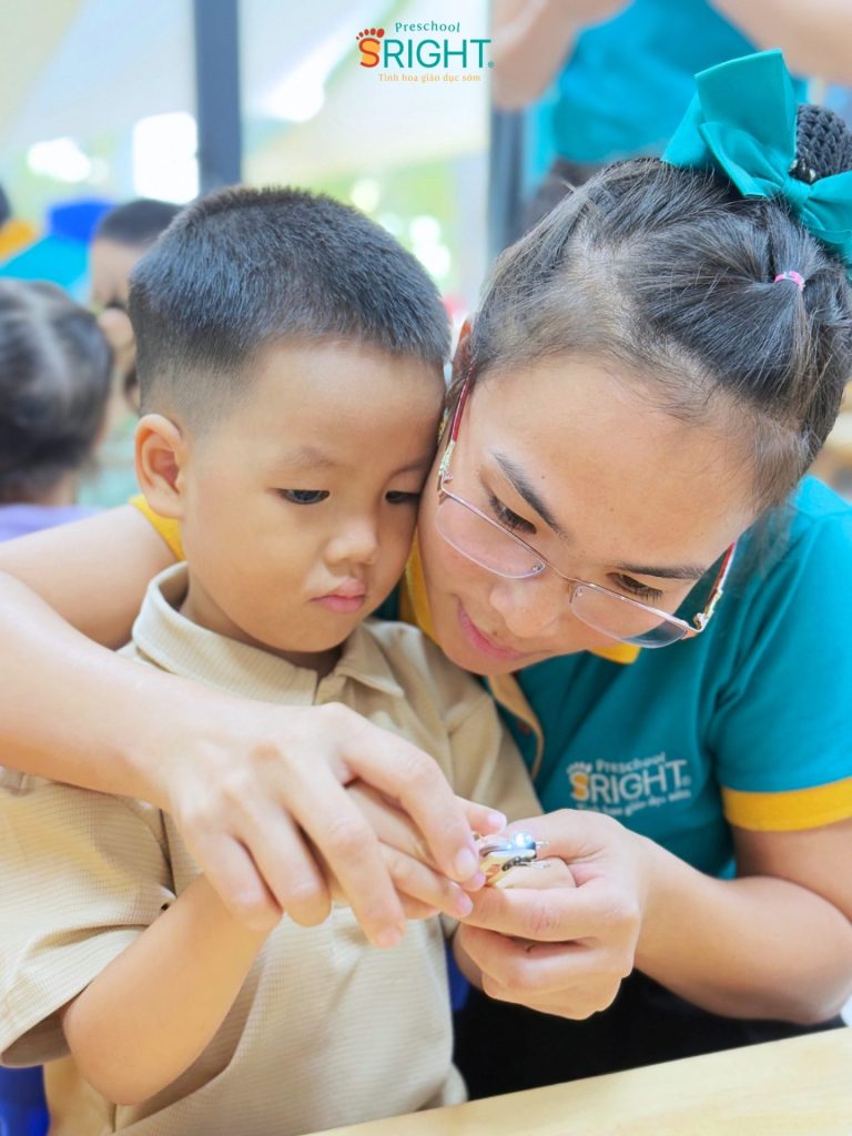 At Sright Preschool, a premier preschool in Thu Duc, we place a strong emphasis on right brain activation methods by allowing children to experience empirical evidence rather than just listening to theory. In today’s lesson, the Country Class students directly observed and familiarized themselves with batteries, LED bulbs, and necessary components. Listening to the teacher explain the mechanism of light creation and how parts connect not only expands basic physics knowledge but also stimulates the imagination, helping the brain form high-quality neural connections through real-world problem-solving.