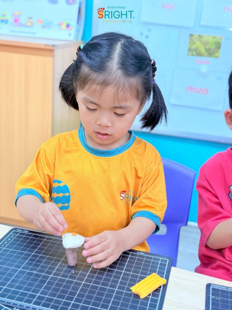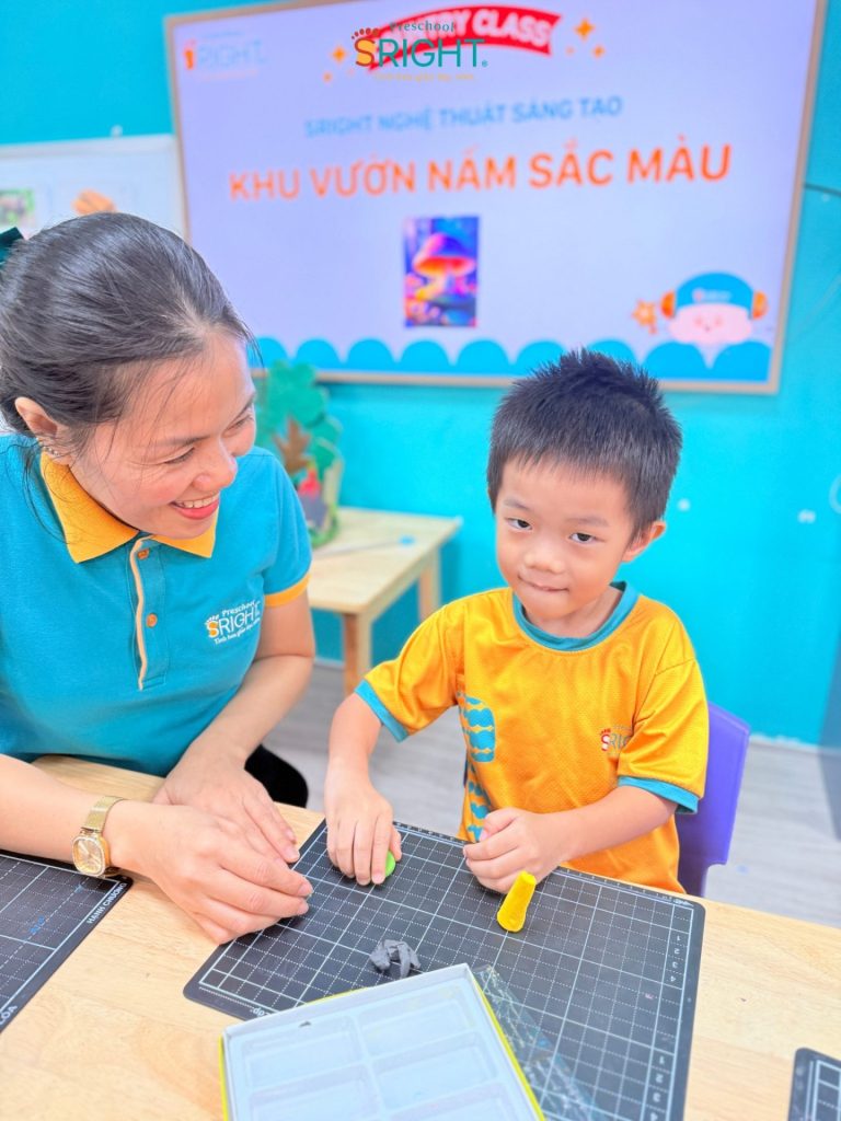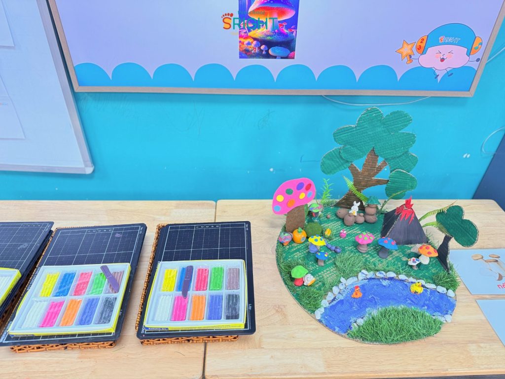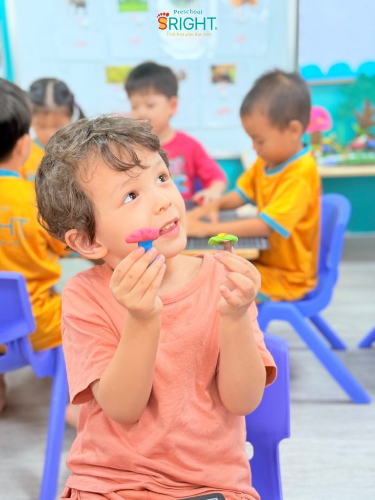 At Sright Preschool, a premier preschool in Thu Duc, we place a strong emphasis on right brain activation methods by exposing children to vivid learning materials and meticulous handicraft activities. In this lesson, Country Class students explored various types of colorful mushrooms through cute visual aids. Listening to the teacher’s step-by-step instructions on kneading clay and coordinating colors helps children’s brains form high-quality neural connections. This process not only expands their imagination of a vibrant “mushroom garden” but also optimizes their ability to visualize and process spatial information.