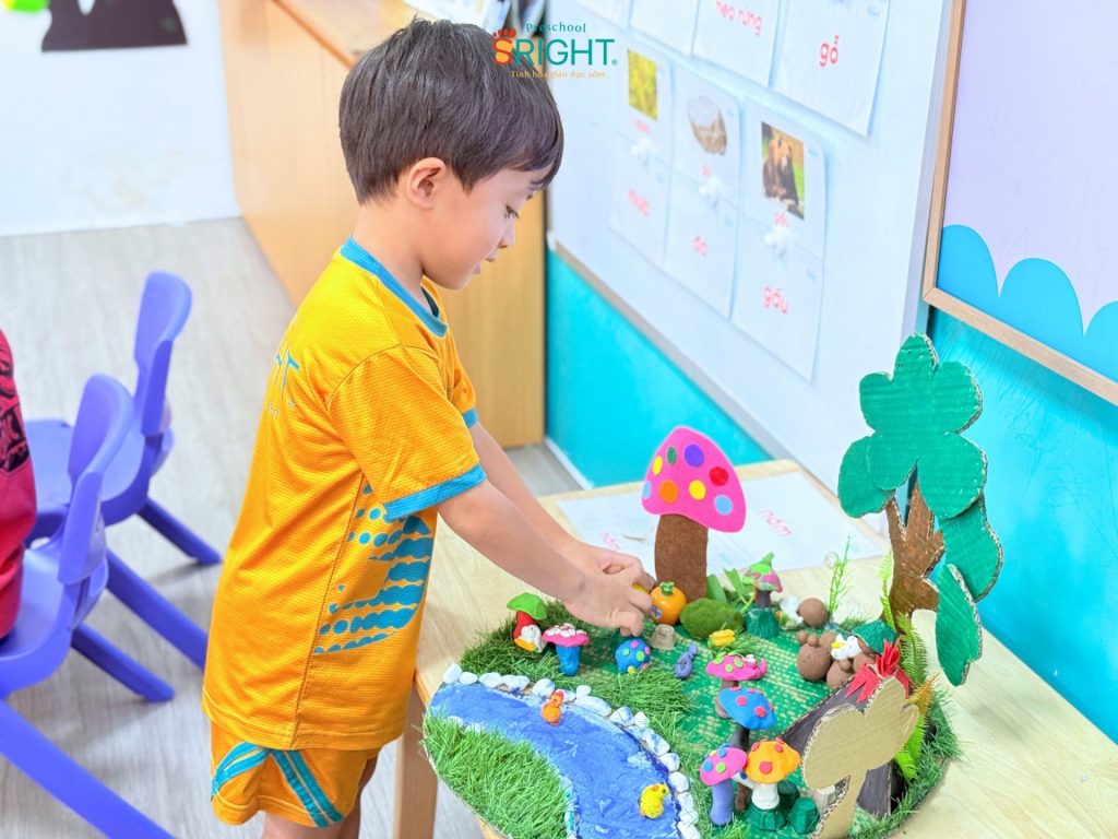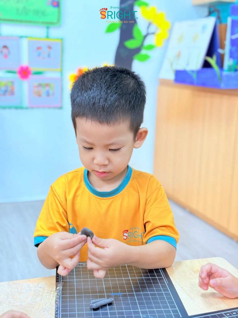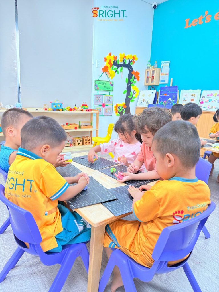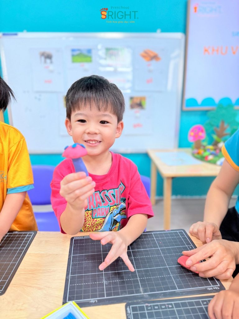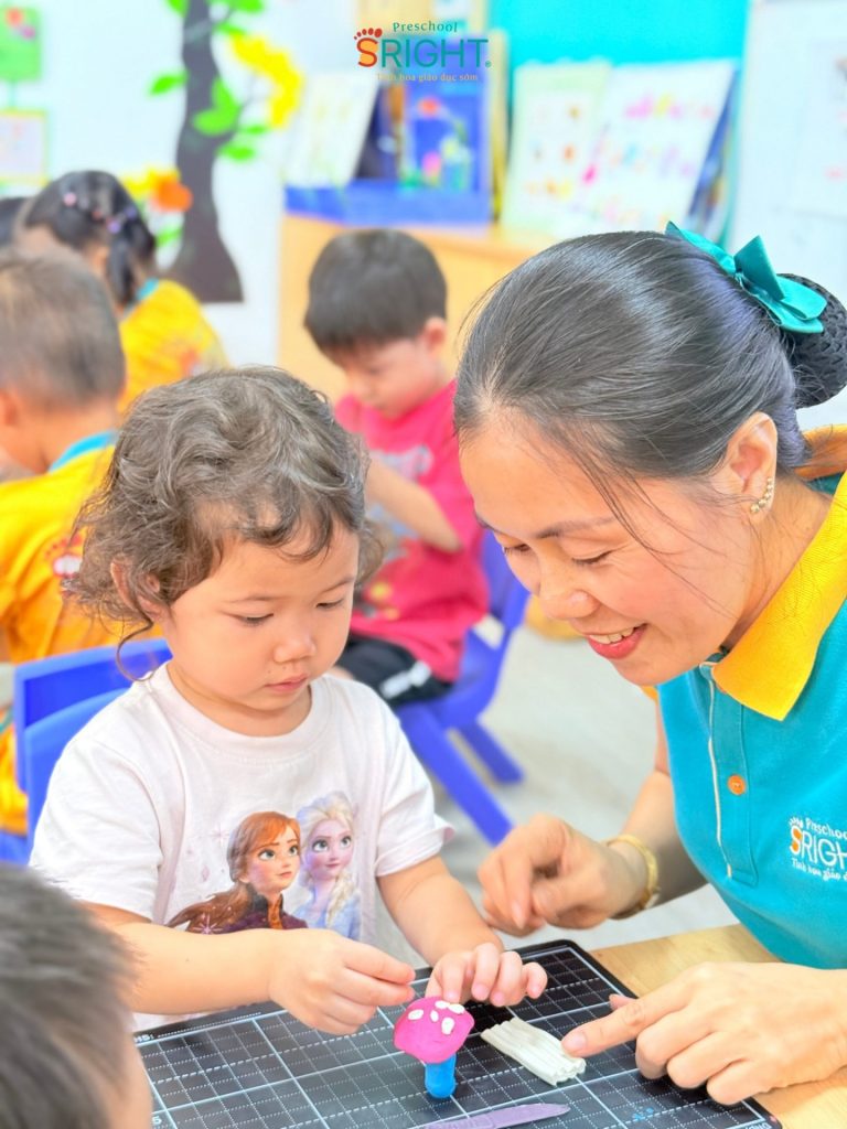 At Sright Preschool, a premier preschool in Thu Duc, we place a strong emphasis on right brain activation methods by exposing children to vivid learning materials and meticulous handicraft activities. In this lesson, Country Class students explored various types of colorful mushrooms through cute visual aids. Listening to the teacher’s step-by-step instructions on kneading clay and coordinating colors helps children’s brains form high-quality neural connections. This process not only expands their imagination of a vibrant “mushroom garden” but also optimizes their ability to visualize and process spatial information.