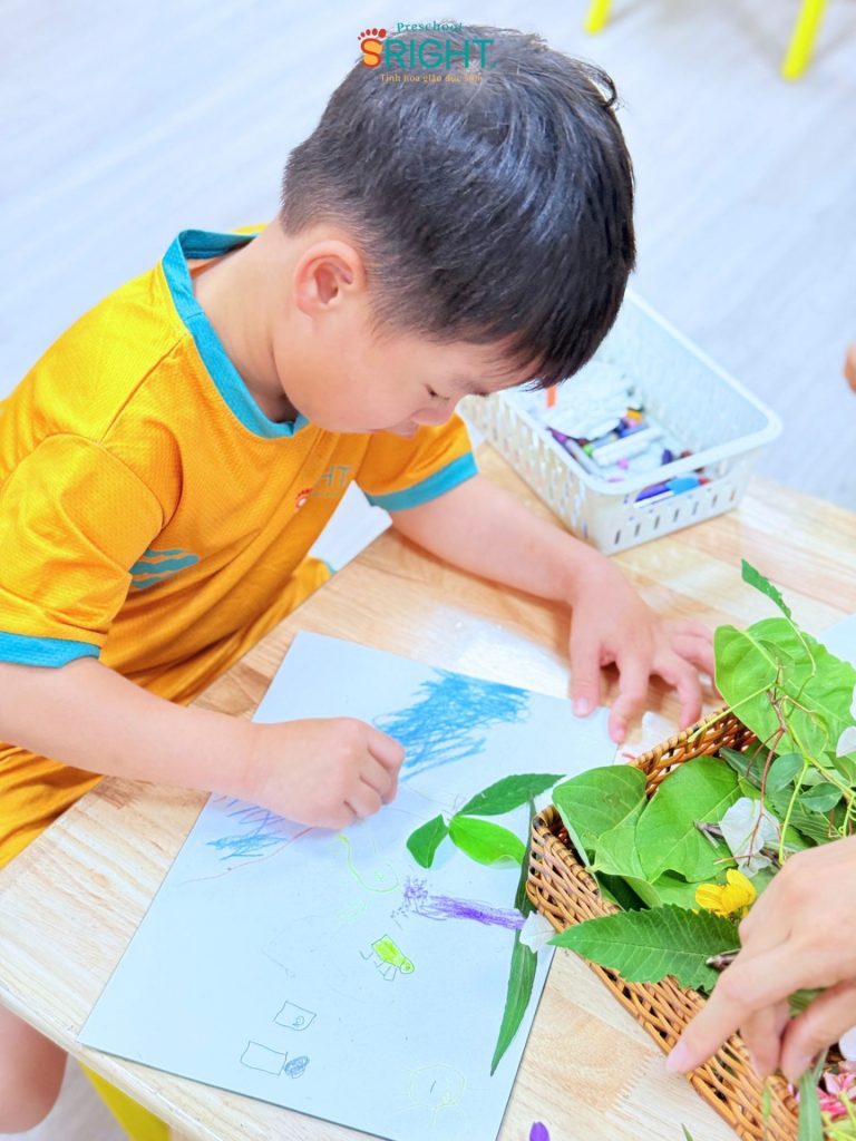 At Sright Preschool, a premier preschool in Thu Duc, we place a strong emphasis on right brain activation methods by exposing children to vivid visual imagery and real-world materials. In this lesson, Earth Class students explored various types of leaves with diverse shapes and colors. Listening to the teacher’s guidance on shaping and arrangement helps children’s brains form high-quality neural connections. This process not only expands their imagination of a “mini forest” but also optimizes their ability to visualize and process spatial information.