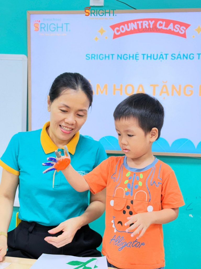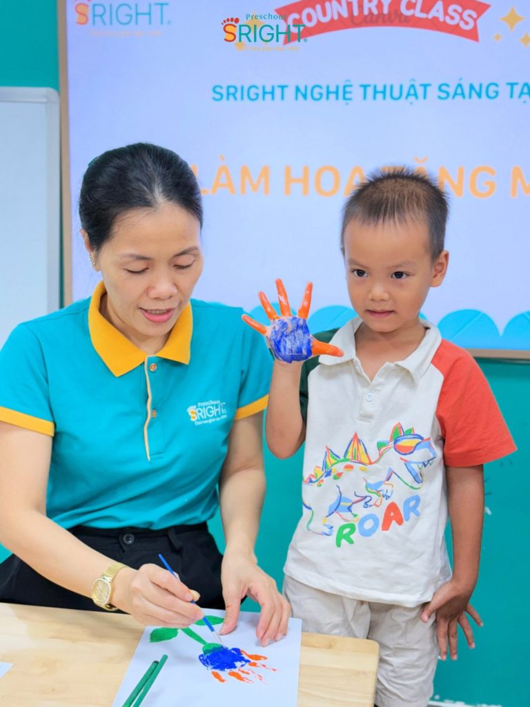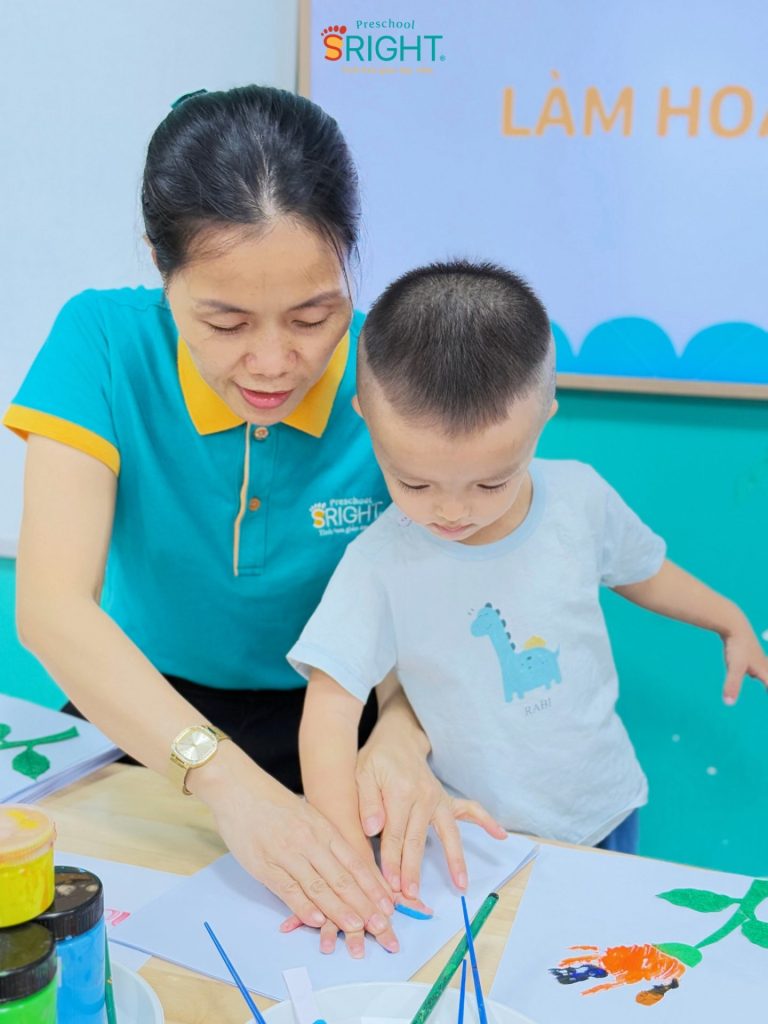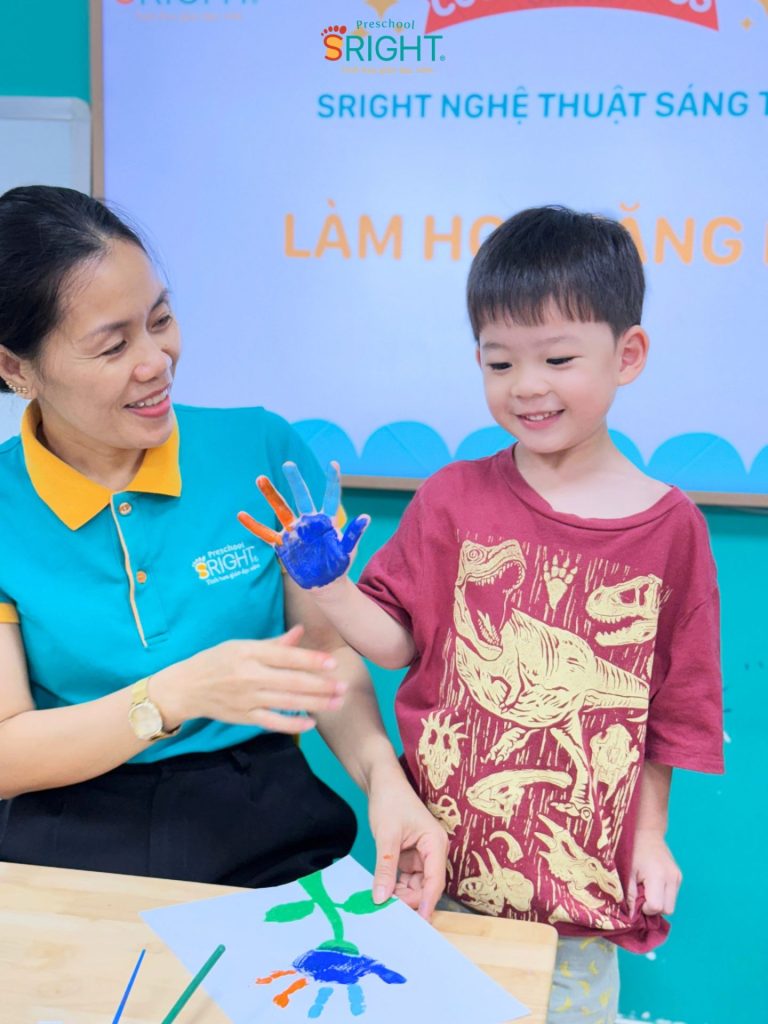 At Sright Preschool, a premier preschool in Thu Duc, we place a high priority on right brain activation methods by encouraging children to freely express themselves through their senses. In today’s lesson, instead of using standard templates, the children were guided to use their own tiny hands to dip in paint and press onto paper to create vibrant flower petals. Directly sensing the texture of the watercolors and observing the formation of their “masterpiece” stimulates the imagination, develops visual thinking, and enhances fine motor coordination effectively.