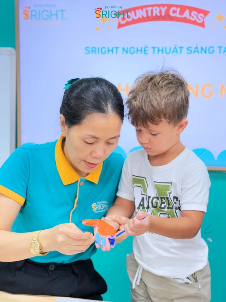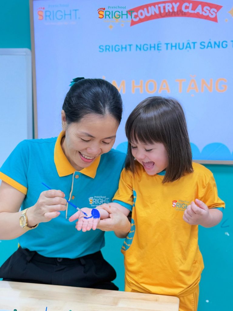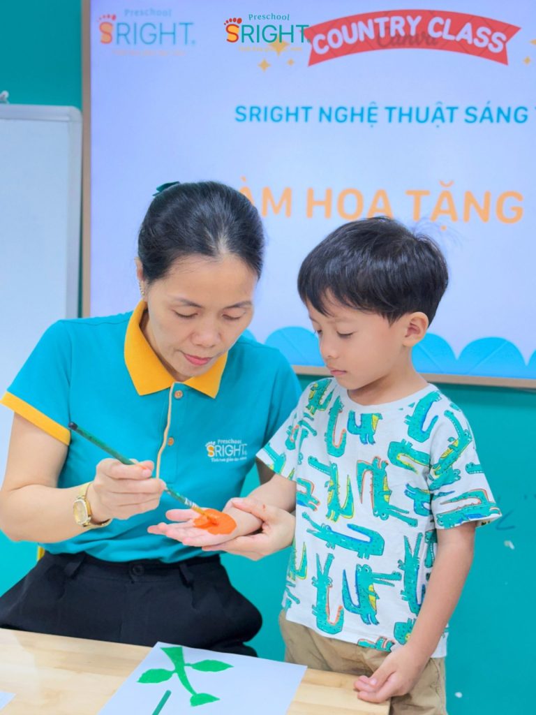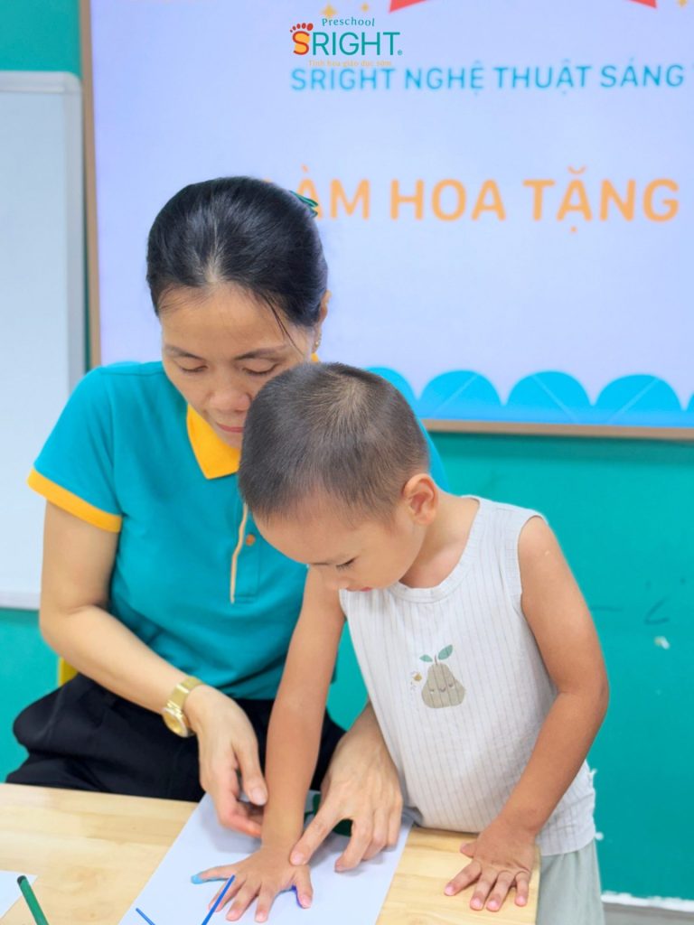 At Sright Preschool, a premier preschool in Thu Duc, we place a high priority on right brain activation methods by encouraging children to freely express themselves through their senses. In today’s lesson, instead of using standard templates, the children were guided to use their own tiny hands to dip in paint and press onto paper to create vibrant flower petals. Directly sensing the texture of the watercolors and observing the formation of their “masterpiece” stimulates the imagination, develops visual thinking, and enhances fine motor coordination effectively.