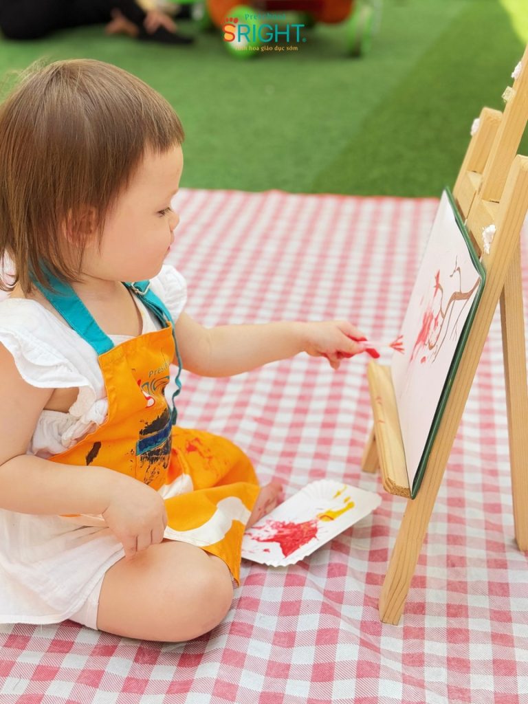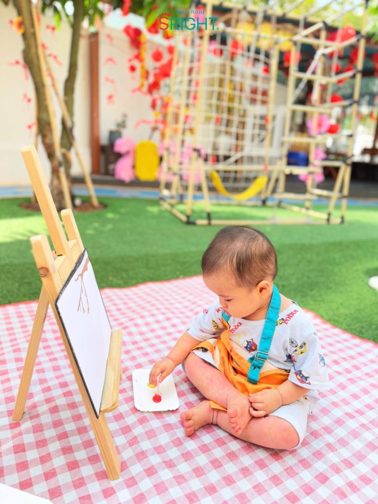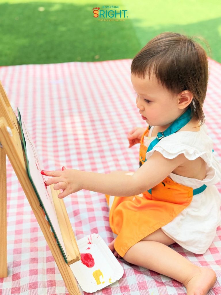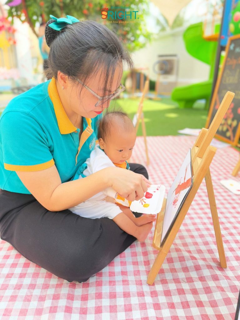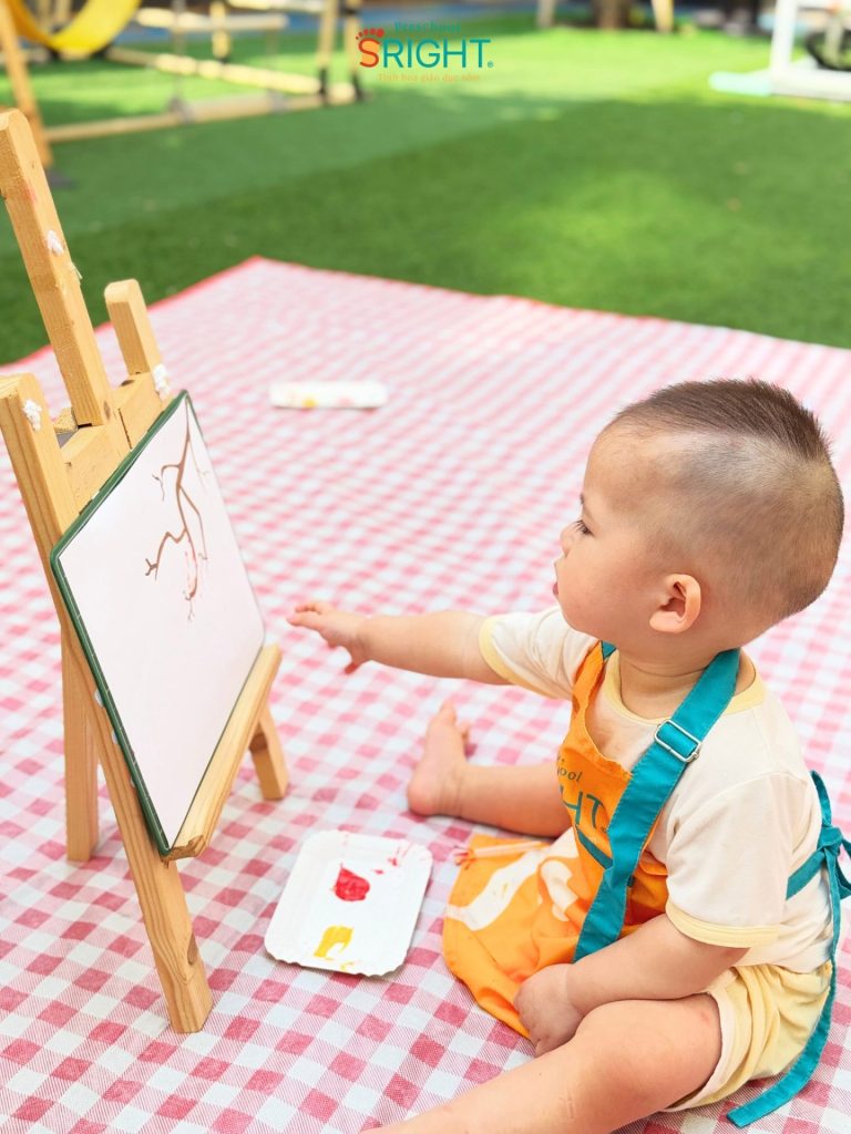 At Sright Preschool, a premier preschool in Thu Duc, we place a high priority on right brain activation methods by introducing children directly to a world of vibrant colors. Instead of using traditional brushes, the Baby SRIGHTers received 1-on-1 guidance from their teachers on how to “dot” colors onto spring branches using their tiny fingers. Sensing the transformation as each dot of color appeared on the paper not only develops their senses but also stimulates color recognition and visual processing, building a solid foundation for abstract thinking and future creativity.