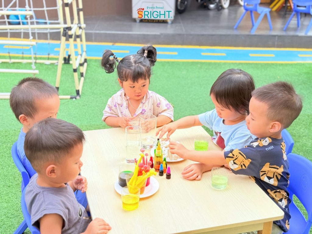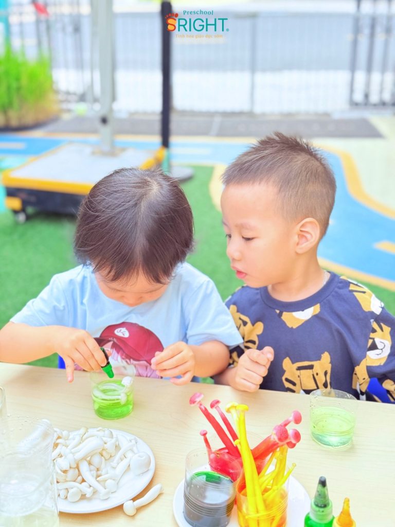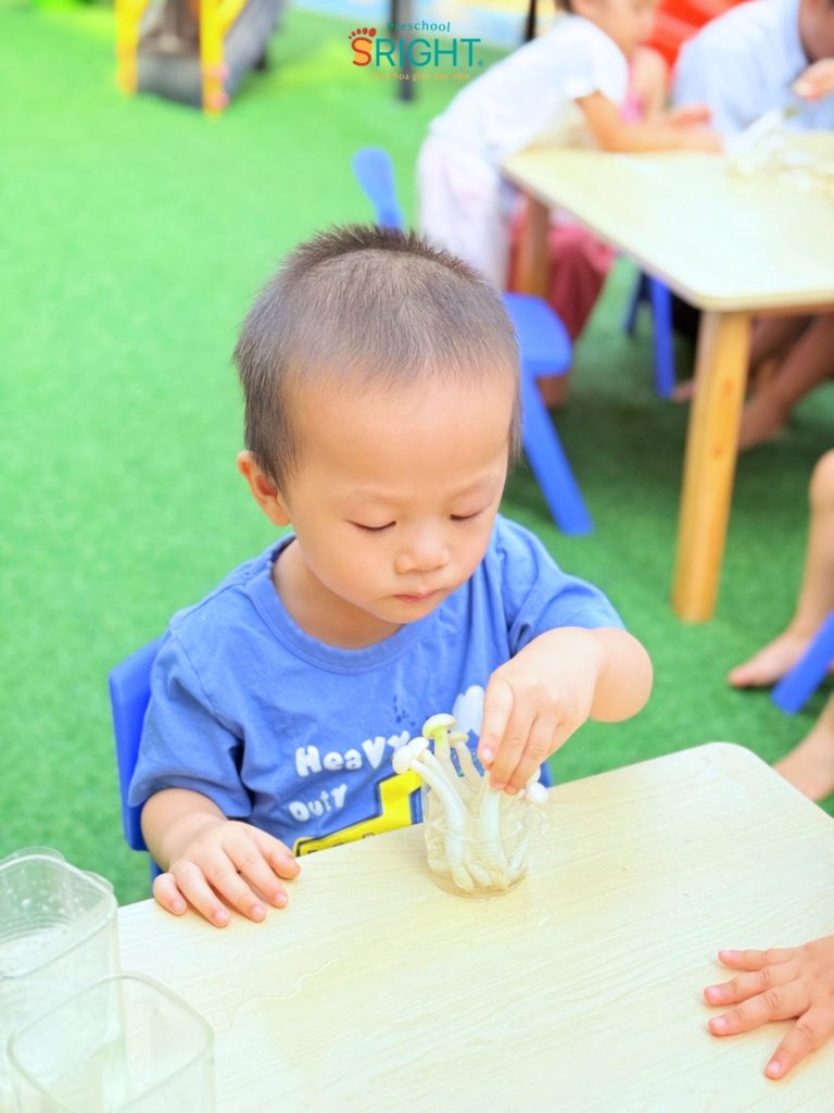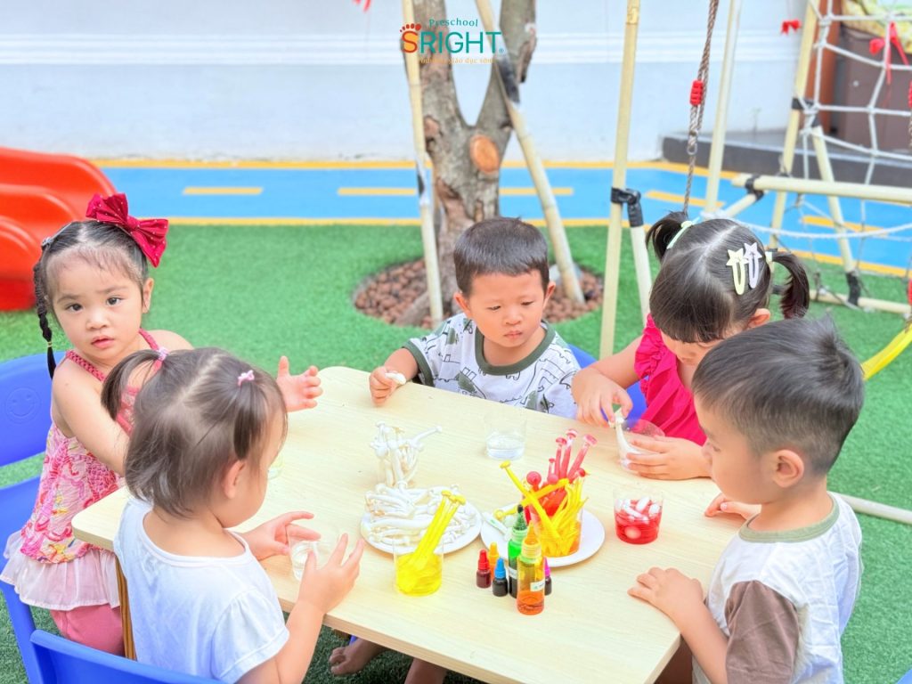 The journey of growth at Sright Preschool is a series of endless “learn through play” days, where every simple phenomenon becomes an inspiring lesson. As a reputable preschool in Thu Duc, we are committed to providing a happy educational environment where children are free to explore and express their personal identities. We invite parents to follow the sparkling eyes and enthusiasm of our City Class SRIGHTers in today’s “Color-Changing Mushroom” experiment to witness the remarkable growth and infinite creative potential of your children at Sright Preschool.