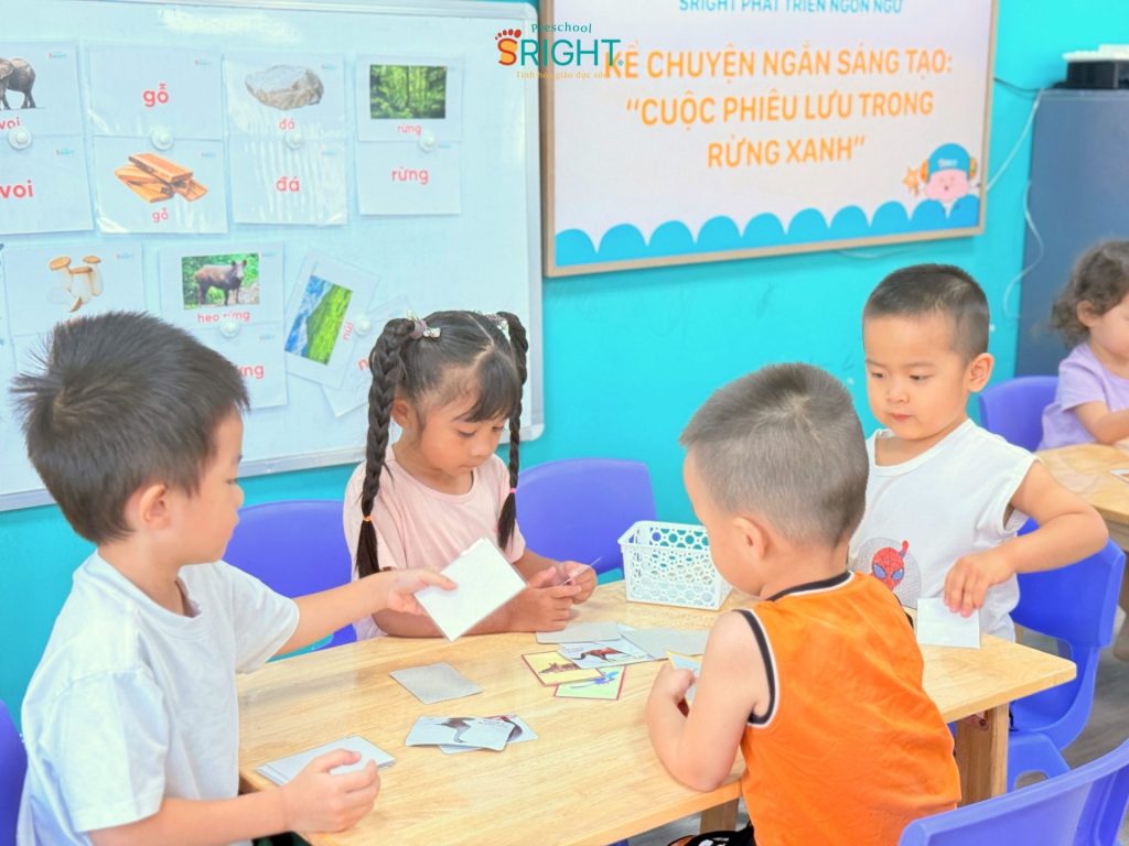 At Sright Preschool, a premier preschool in Thu Duc, we place a strong emphasis on right brain activation methods by utilizing vivid visual aids and dynamic Flashcards. In this lesson, every leaf and every animal in the forest became a soulful character through the children’s narration. Role-playing and arranging ideas in a logical sequence help the children’s brains form high-quality neural connections. This method not only expands vocabulary but also develops whole-pattern memorization and creative thinking, empowering Country Class students to weave stories full of color and emotion.