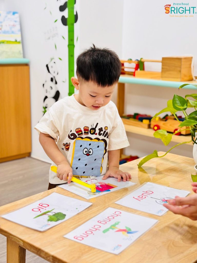 ๐ Lessons at SRIGHT are conducted entirely without electronic devices. Yet, the atmosphere of the class is always vibrant with colorful Flashcards! The teacher brought the children closer to familiar images of Vietnamese folk culture such as bright pinwheels, creative coloring activities, and childhood kites. With its rapid pace and information repetition, PF2B not only helps children quickly memorize information but also strongly stimulates their image processing abilities, develops rich imagination, and helps them easily remember large chunks of text and image information.