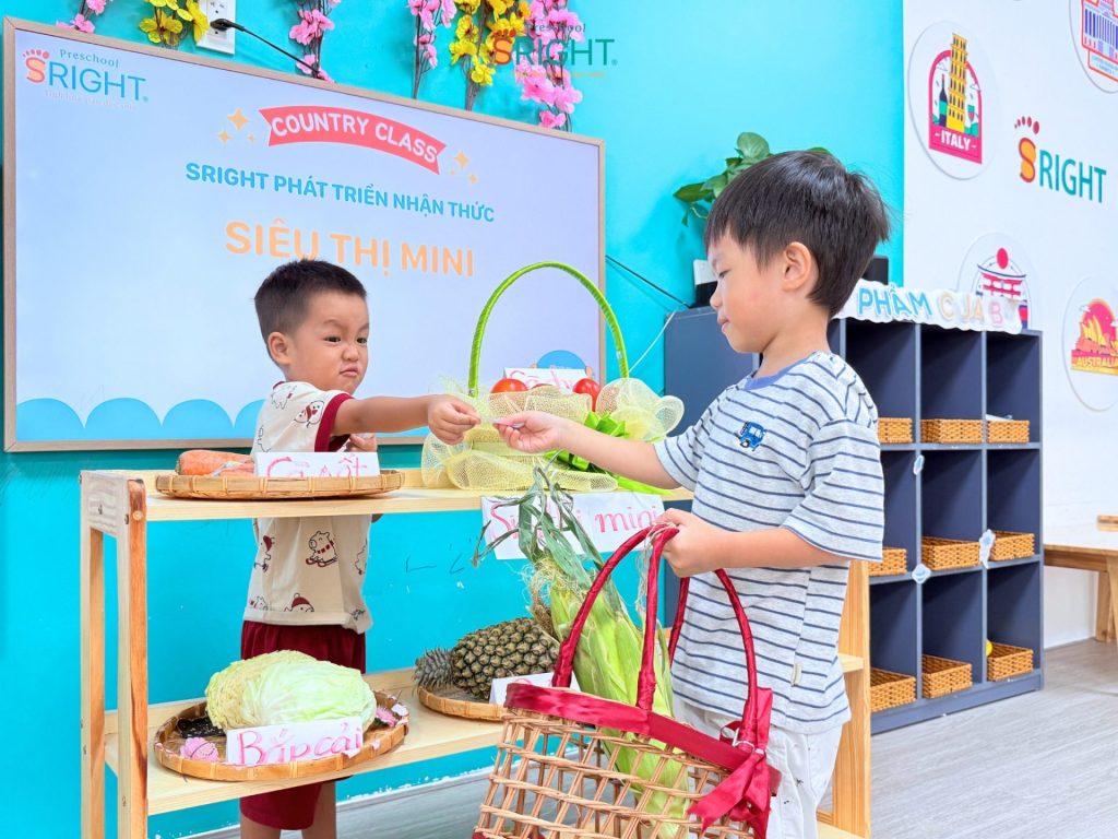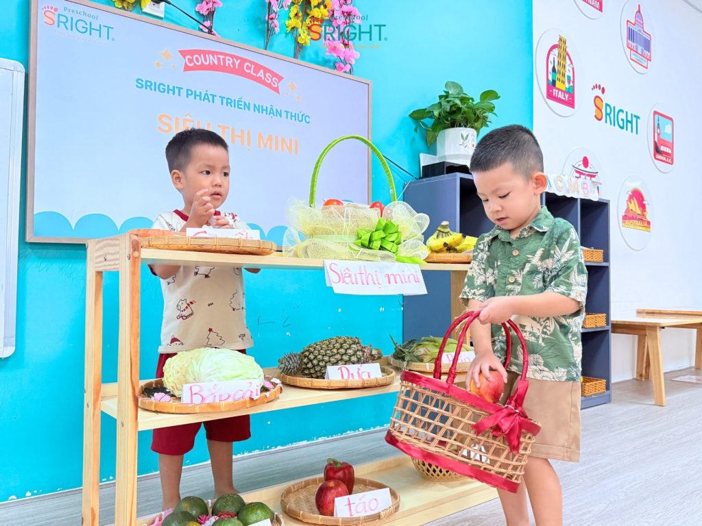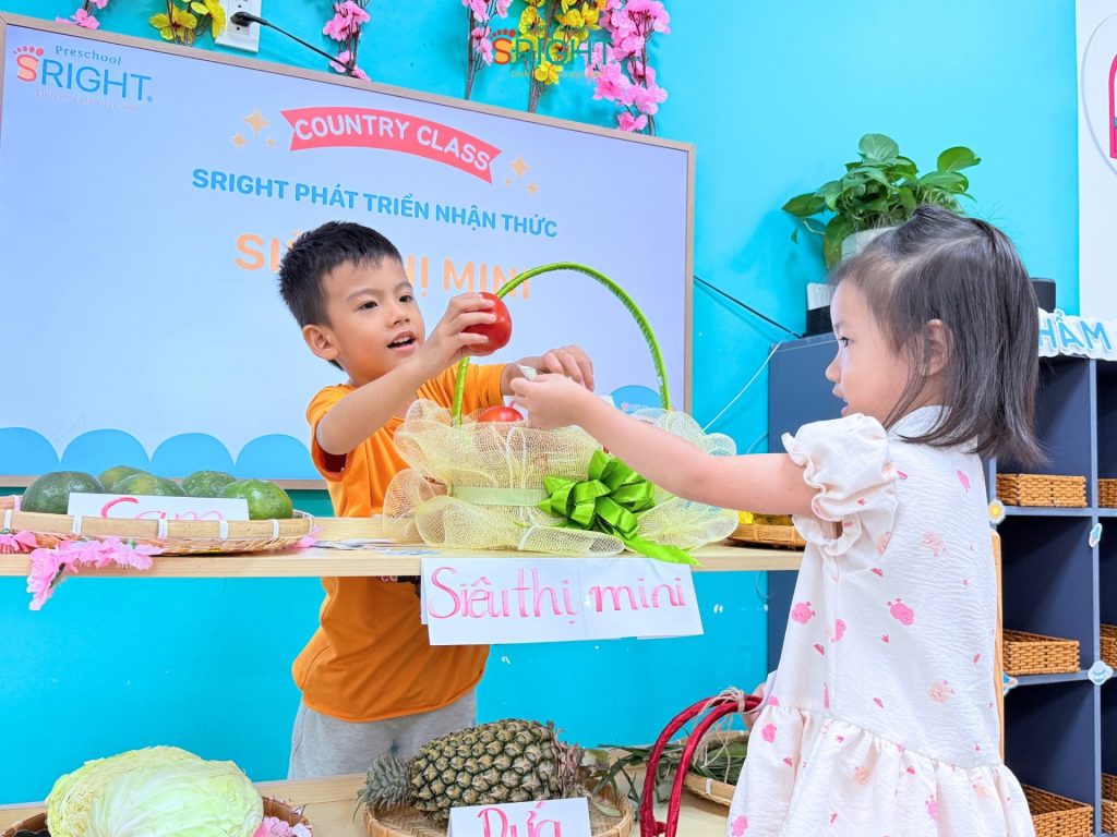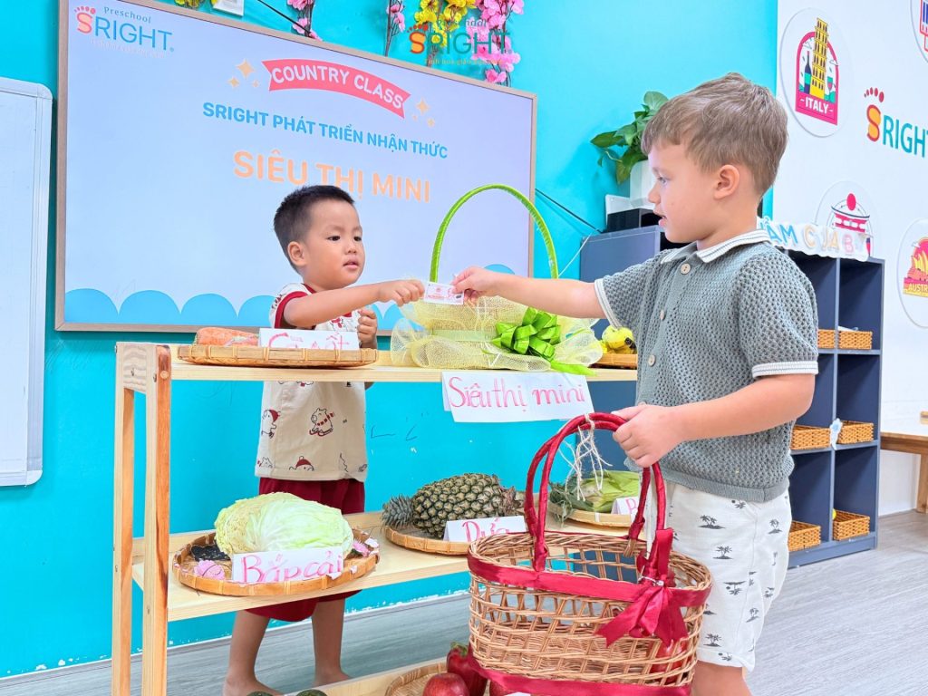 Những câu nói ngây ngô như: “Con bán táo nè!”, “Con mua cà rốt!” hay “Cho con trái chuối ạ!” vang lên khắp lớp, tạo nên một không gian học tập tương tác cực kỳ sôi động. Thông qua các hoạt động này, SRIGHT Preschool giúp trẻ rèn luyện kỹ năng giao tiếp, sự tự tin khi tương tác với bạn bè và bước đầu hình thành tư duy về các vai trò trong xã hội.