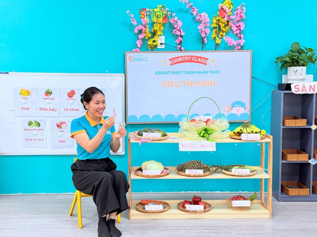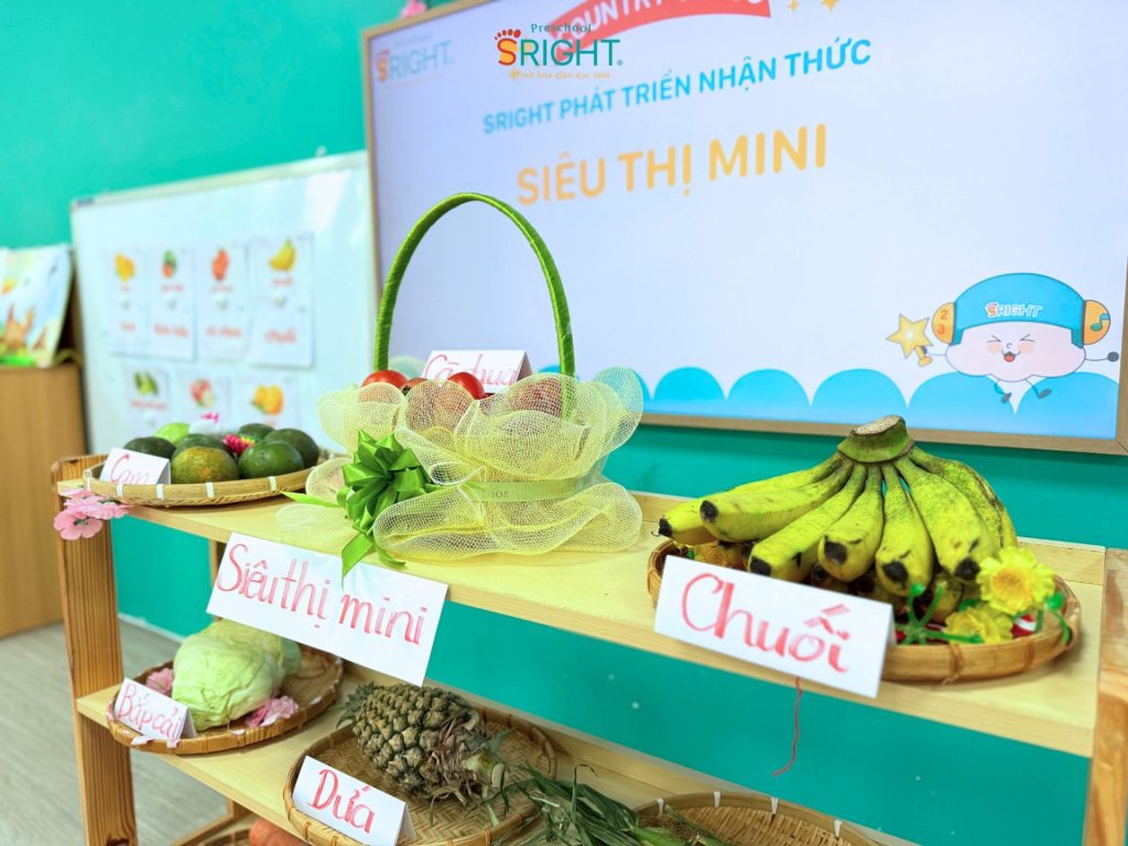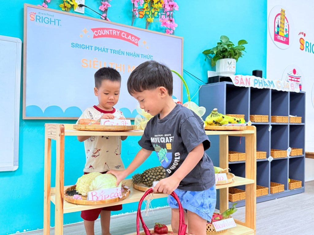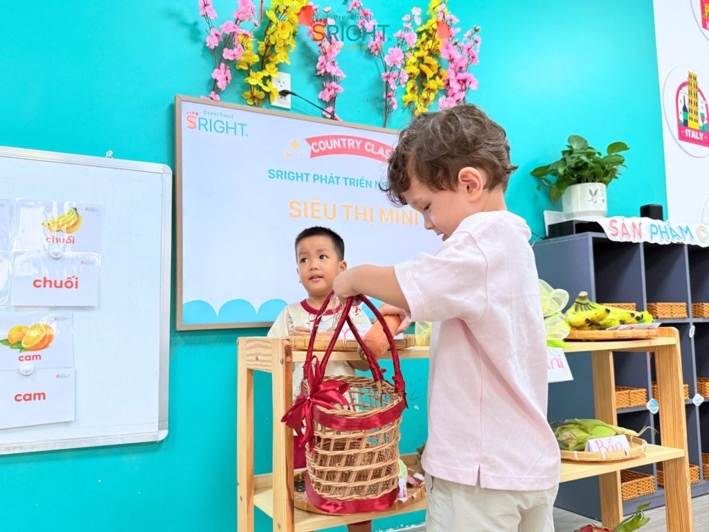 Những câu nói ngây ngô như: “Con bán táo nè!”, “Con mua cà rốt!” hay “Cho con trái chuối ạ!” vang lên khắp lớp, tạo nên một không gian học tập tương tác cực kỳ sôi động. Thông qua các hoạt động này, SRIGHT Preschool giúp trẻ rèn luyện kỹ năng giao tiếp, sự tự tin khi tương tác với bạn bè và bước đầu hình thành tư duy về các vai trò trong xã hội.
