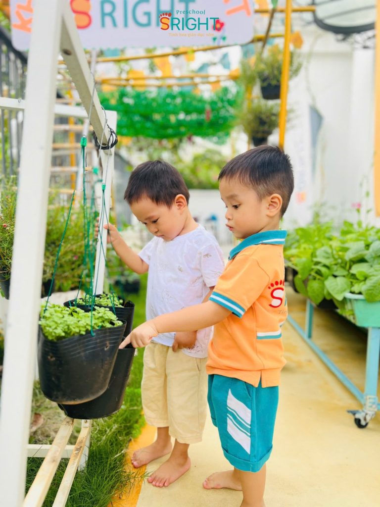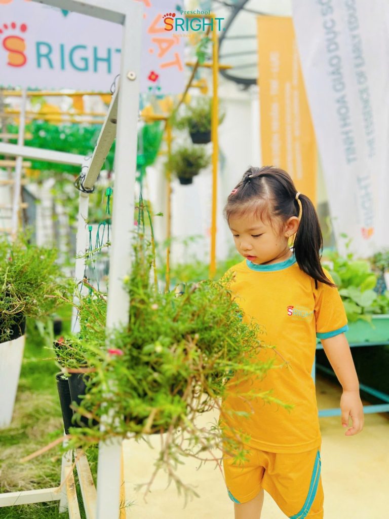Ở SRIGHT Preschool, thay vì những bài học khô khan qua sách vở, giáo dục mầm non tại SRIGHT chú trọng vào các hoạt động ngoài trời thực tế. Trong không gian xanh mát, các SRIGHTers lớp City đã được cô giáo hướng dẫn cách quan sát, chạm nhẹ vào lá và sử dụng bình tưới đúng cách.