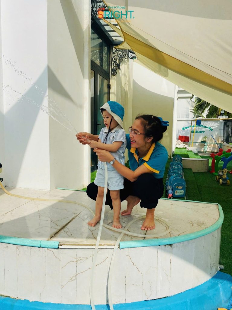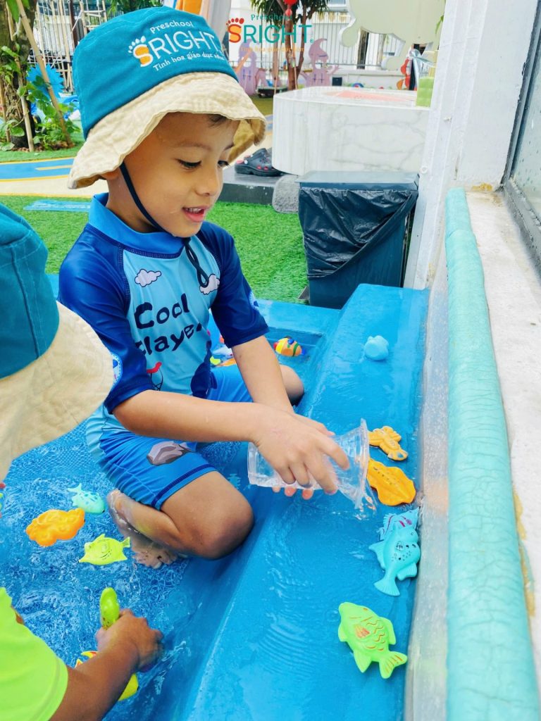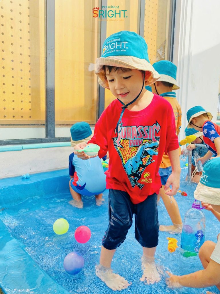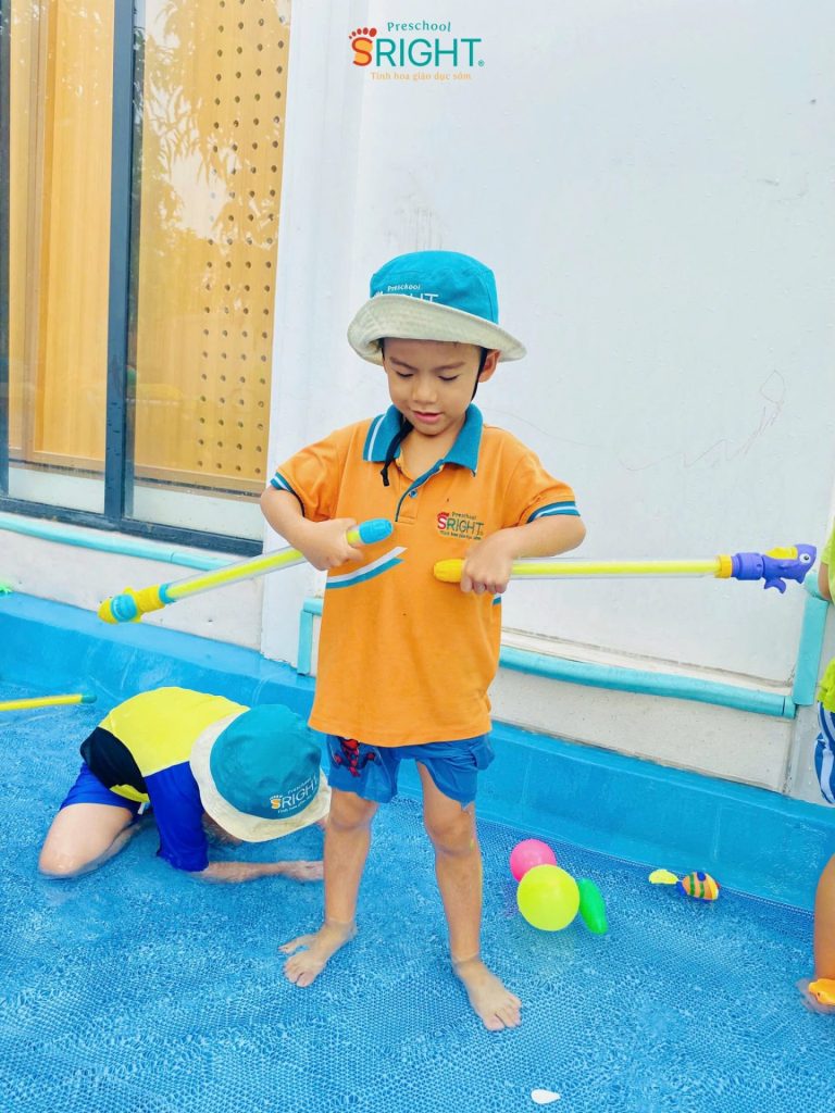 Dưới không gian bể nước mát lành cùng những món đồ chơi nước xinh xắn, các bạn nhỏ lớp Country đã được thỏa sức vui đùa, tận hưởng ánh nắng vàng và những làn gió mát lạnh. Thông qua hoạt động này, SRIGHT Preschool lồng ghép khéo léo các bài học về giáo dục sớm như: phát triển vận động tinh và thô, nhận biết màu sắc qua làn nước, cùng kỹ năng chờ đến lượt và sẻ chia đồ chơi với bạn bè. Những khoảnh khắc này giúp các con học cách tận hưởng niềm vui lành mạnh trong một môi trường an toàn và tràn đầy yêu thương.