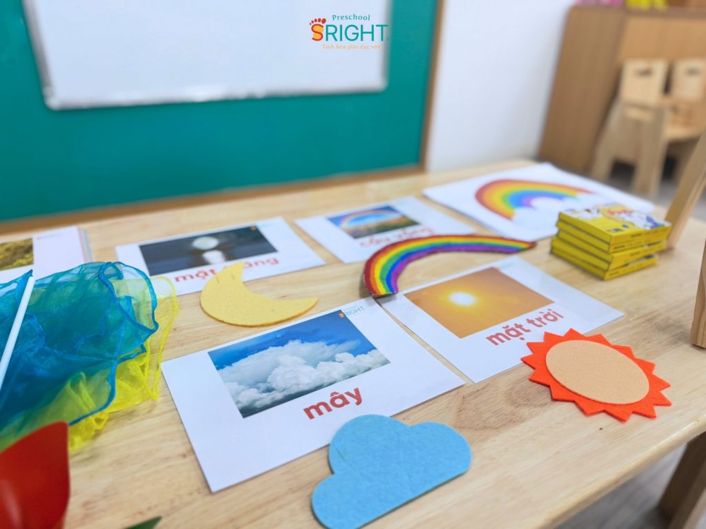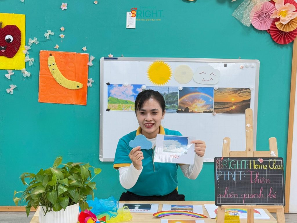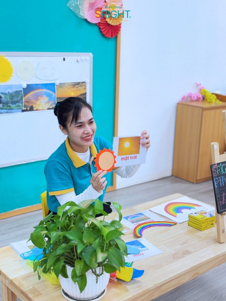 Tại trường mầm non Thủ Đức – Sright Preschool, chúng tôi áp dụng phương pháp kích hoạt não phải để trẻ tiếp nhận kiến thức thông qua hình ảnh trực quan và cảm xúc chân thực. Trong tiết học, các bạn nhỏ lớp Home đã được làm quen với những biểu tượng quen thuộc như mặt trời rạng rỡ, mặt trăng dịu hiền, mây trắng và cầu vồng đa sắc. Việc lắng nghe cô giáo giảng bài kết hợp với những câu chuyện kể sinh động giúp trẻ hình thành tư duy hình ảnh mạnh mẽ, từ đó mở rộng vốn từ vựng và khả năng hiểu biết về các yếu tố tự nhiên xung quanh cuộc sống hàng ngày một cách sâu sắc.
