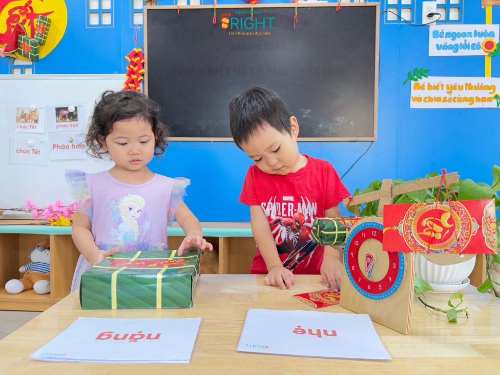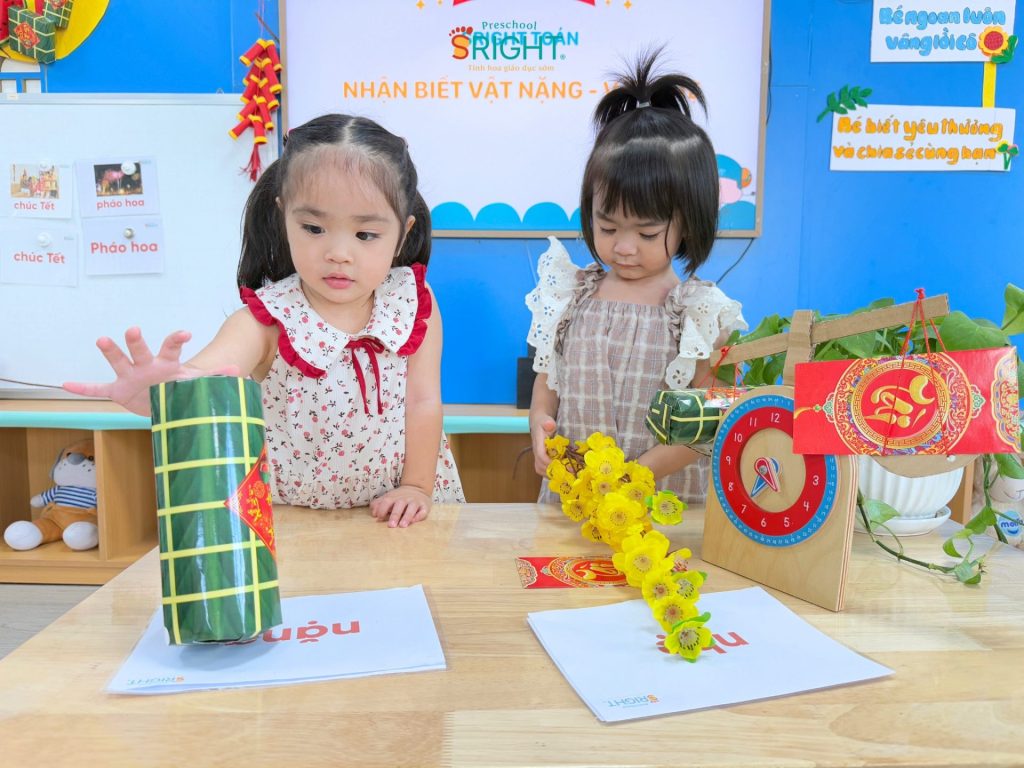 Tại trường mầm non Thủ Đức – Sright Preschool, việc áp dụng phương pháp kích hoạt não phải giúp trẻ tiếp nhận kiến thức thông qua hình ảnh và sự cảm nhận trực tiếp. Thay vì chỉ nghe giảng, các SRIGHTers lớp City đã ngồi theo từng nhóm nhỏ để quan sát cô giáo làm mẫu và so sánh các vật dụng trên cân. Những khái niệm như trọng lượng, sự cân bằng vốn khó hiểu đã trở nên vô cùng gần gũi khi các con được tự tay đặt đồ vật lên cân, cảm nhận sự chênh lệch và hào hứng reo hò khi “đoán đúng” kết quả. Cách tiếp cận này giúp trẻ ghi nhớ lâu hơn và hình thành niềm yêu thích học tập ngay từ những bước đầu đời.