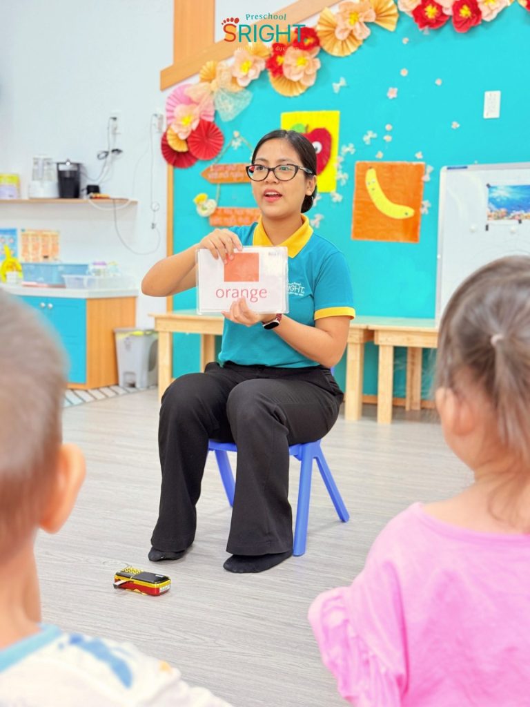 Tại trường mầm non Thủ Đức – Sright Preschool, chúng tôi hiểu rằng não bộ của trẻ trong giai đoạn vàng có khả năng chụp hình nguyên mảng cực kỳ ấn tượng. Trong giờ học cùng Teacher Frahn, phương pháp kích hoạt não phải được vận dụng tối đa thông qua hệ thống Flash Card sinh động. Thay vì sử dụng màn hình điện tử, các con được rèn luyện khả năng quan sát và phản xạ nhanh với các thẻ hình tốc độ cao. Việc lắng nghe và nhận diện âm thanh hằng ngày giúp não bộ hình thành các liên kết neuron thần kinh chất lượng tại vùng ngôn ngữ, giúp con ghi nhớ từ vựng về màu sắc một cách bền vững và tự nhiên nhất.
