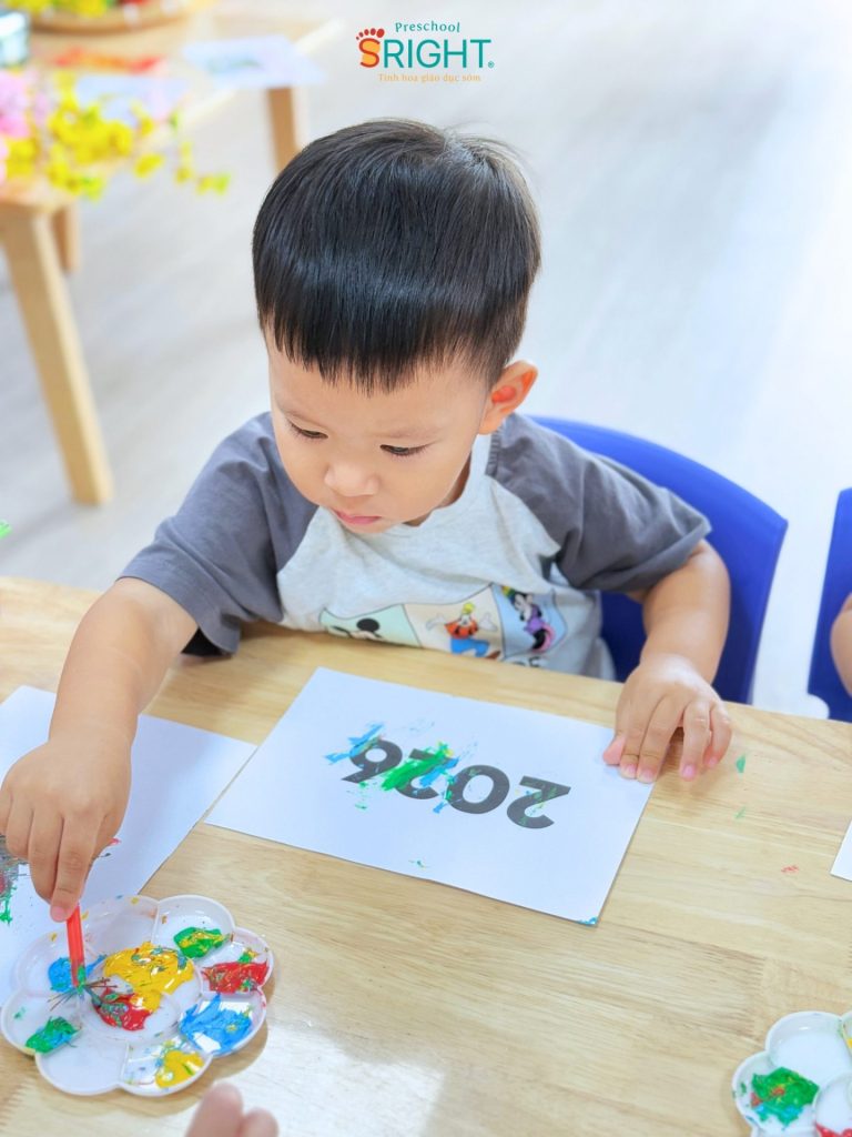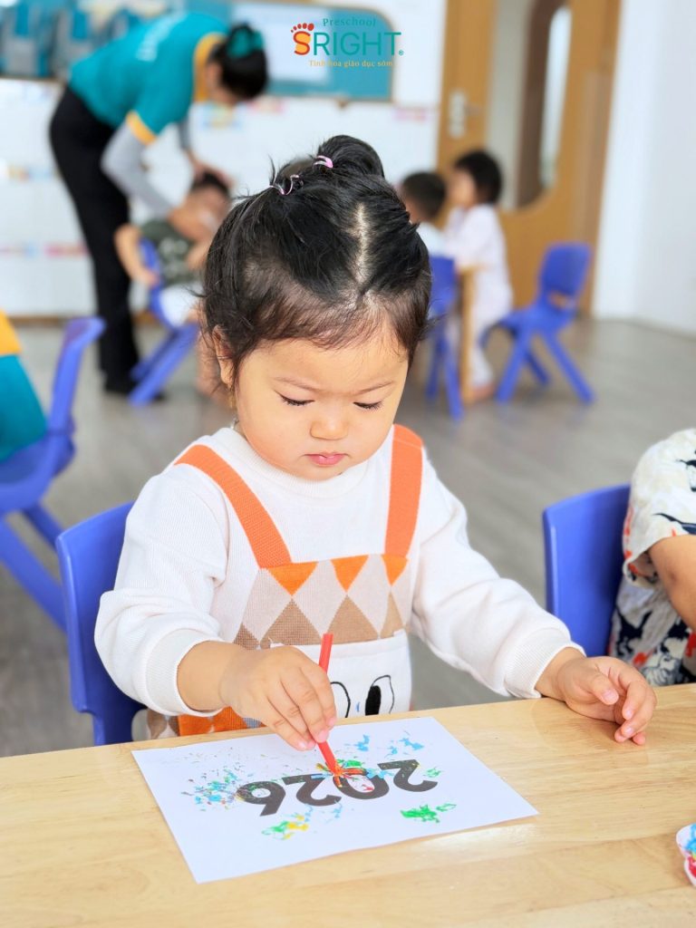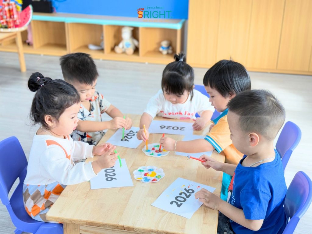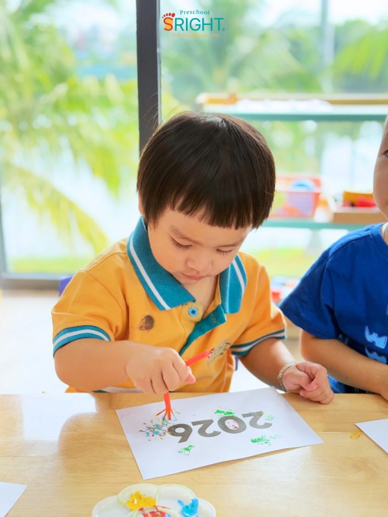 Giáo dục tại một ngôi trường mầm non song ngữ đẳng cấp không chỉ dừng lại ở lý thuyết mà luôn đi đôi với thực hành và bồi đắp kỹ năng sống. Các bạn nhỏ lớp City đã cùng nhau ngồi theo nhóm nhỏ để quan sát, lắng nghe và chia sẻ về những dự định trong ngày Tết. Đặc biệt, khoảnh khắc các con tự tay chấm màu trang trí con số 2026 rực rỡ không chỉ là một hoạt động nghệ thuật mà còn là cách để trẻ thể hiện cảm xúc cá nhân và sự kiên nhẫn. Sự kết hợp giữa giáo dục học thuật và hoạt động trải nghiệm giúp trẻ xây dựng nền tảng tư duy logic lẫn trí tuệ cảm xúc ngay từ những năm tháng đầu đời.