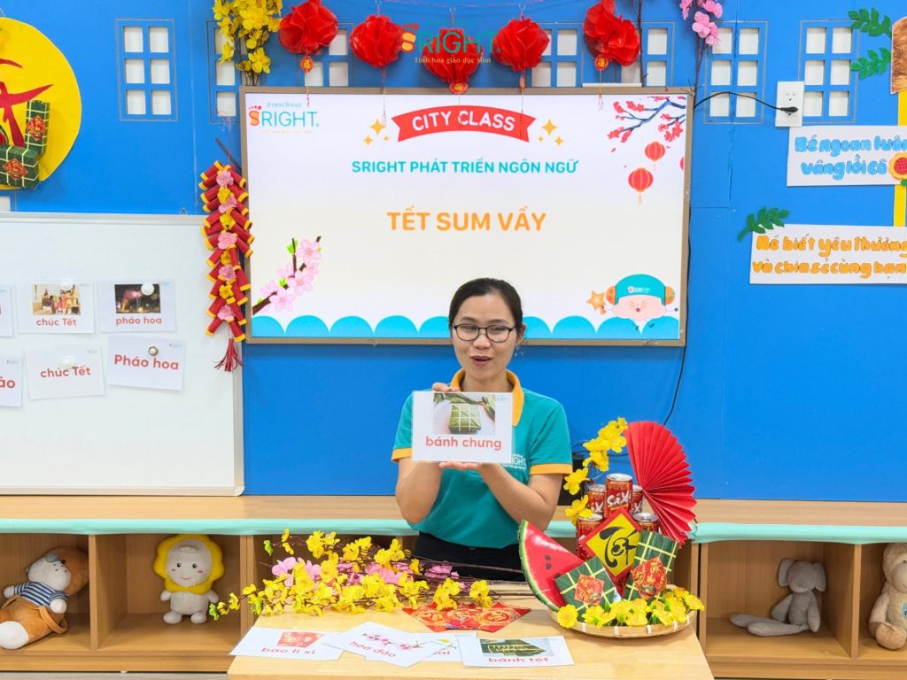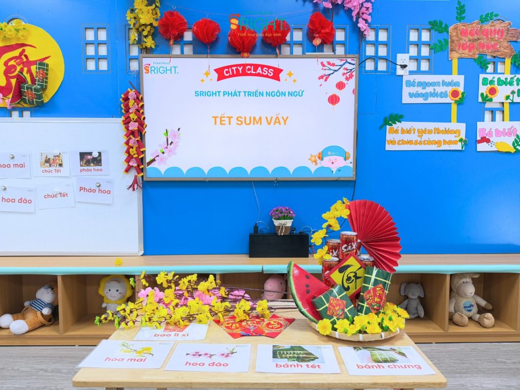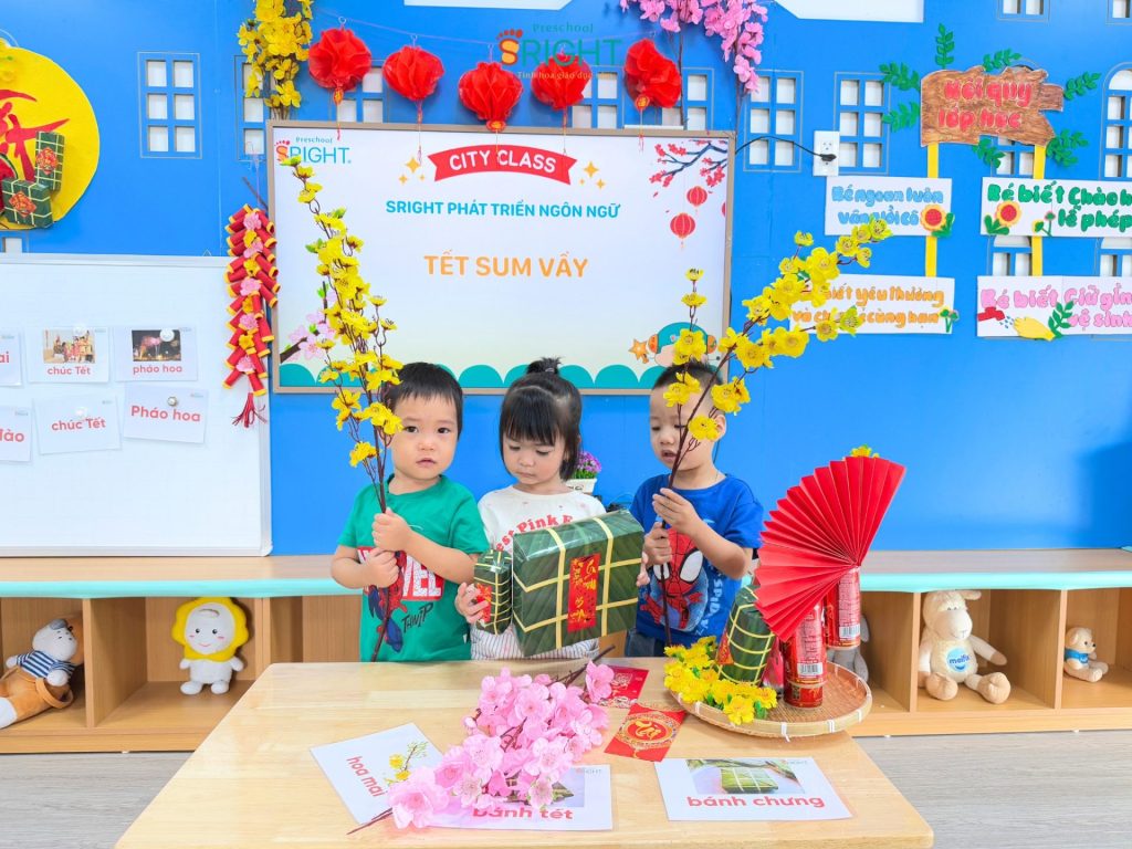 Sright Preschool tin rằng mỗi mùa lễ hội là một cơ hội vàng để trẻ thẩm thấu những giá trị văn hóa truyền thống một cách tự nhiên nhất. Tại ngôi trường mầm non của chúng tôi, không khí Tết không chỉ tràn ngập khắp các phố phường mà đã thực sự ghé thăm lớp City qua một tiết học phát triển ngôn ngữ đầy ấm áp. Đây là một phần quan trọng trong lộ trình giáo dục sớm giúp các con không chỉ mở rộng vốn từ mà còn cảm nhận sâu sắc tình yêu thương và sự gắn kết trong những ngày Xuân cận kề.