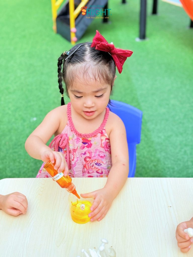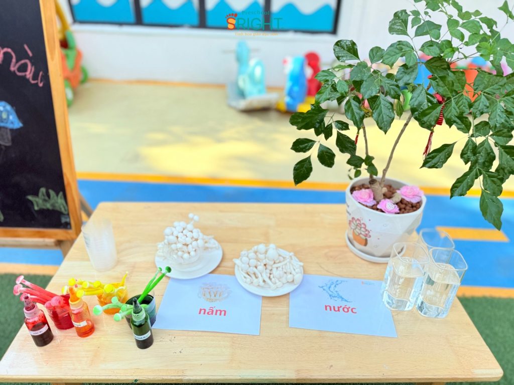 Tại trường mầm non Thủ Đức – Sright Preschool, chúng tôi đặc biệt chú trọng phương pháp kích hoạt não phải bằng cách cho trẻ tiếp cận với các hiện tượng biến đổi vật chất thực tế. Trong tiết học, các bạn nhỏ lớp City đã cùng nhau quan sát những cây nấm trắng muốt và tìm hiểu về đặc điểm hình dáng của chúng. Việc làm quen với màu thực phẩm và nước – những nguyên liệu đầy “phép màu” – giúp não bộ của trẻ hình thành các liên kết neuron thần kinh chất lượng. Khi chứng kiến cây nấm dần đổi sang các màu sắc khác nhau, trẻ không chỉ ngạc nhiên mà còn phát triển khả năng ghi nhớ nguyên mảng và tư duy hình ảnh một cách tối ưu.