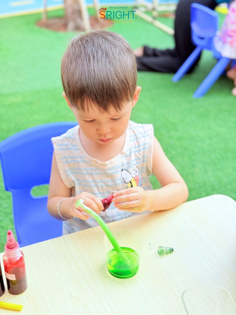 Trong không gian của một ngôi trường mầm non song ngữ đẳng cấp, hoạt động tự tay thực hành thí nghiệm là cơ hội vàng để các con bồi đắp những kỹ năng sống thiết yếu. Dưới sự hướng dẫn tận tâm của giáo viên, từng bạn nhỏ lớp City đã học được cách kiên nhẫn chờ đợi điều kỳ diệu xảy ra. Quá trình quan sát nấm hút nước màu không chỉ giúp trẻ mở rộng vốn từ vựng mà còn rèn luyện tính tỉ mỉ và khả năng tập trung cao độ. Đây chính là giá trị cốt lõi của nền giáo dục tại Sright: giúp trẻ không chỉ tiếp thu kiến thức mà còn bản lĩnh và chủ động trong việc xử lý tình huống thực tế.